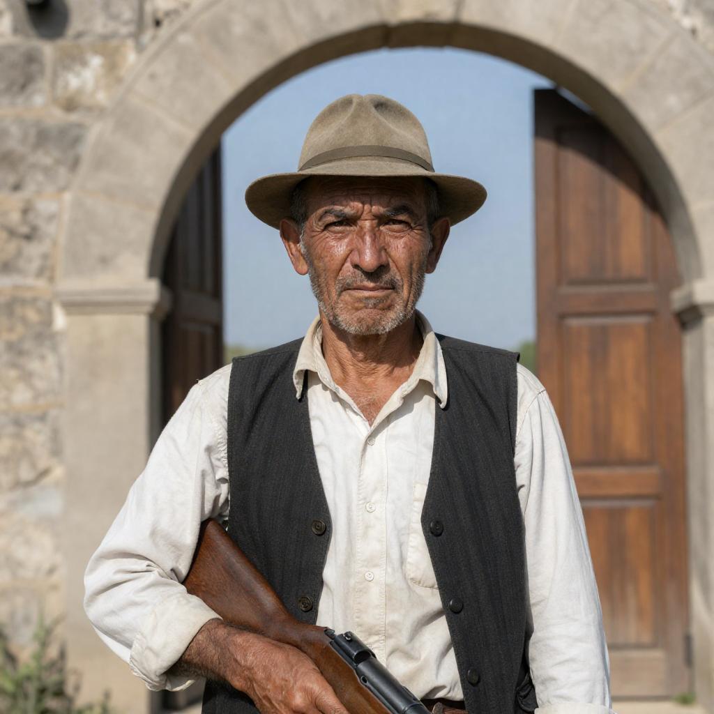Old man with white, messy hair and heavily dirtied face leans into a car's driver seat, gripping a coiled cable. He wears a brown jacket over a beige shirt. Car interior is dimly lit with yellow light from outside. Intense focus.