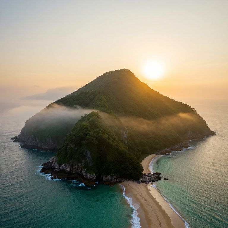 Golden sunlight bathes a solitary, verdant island cloaked in mist, its rugged cliffs and sandy beaches framed by turquoise waters as the sun sets behind its lush peak.