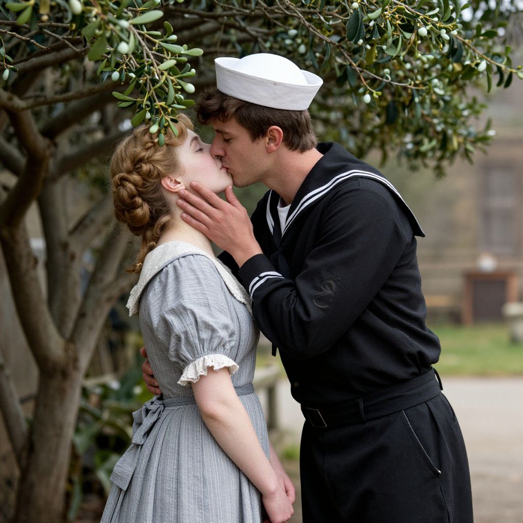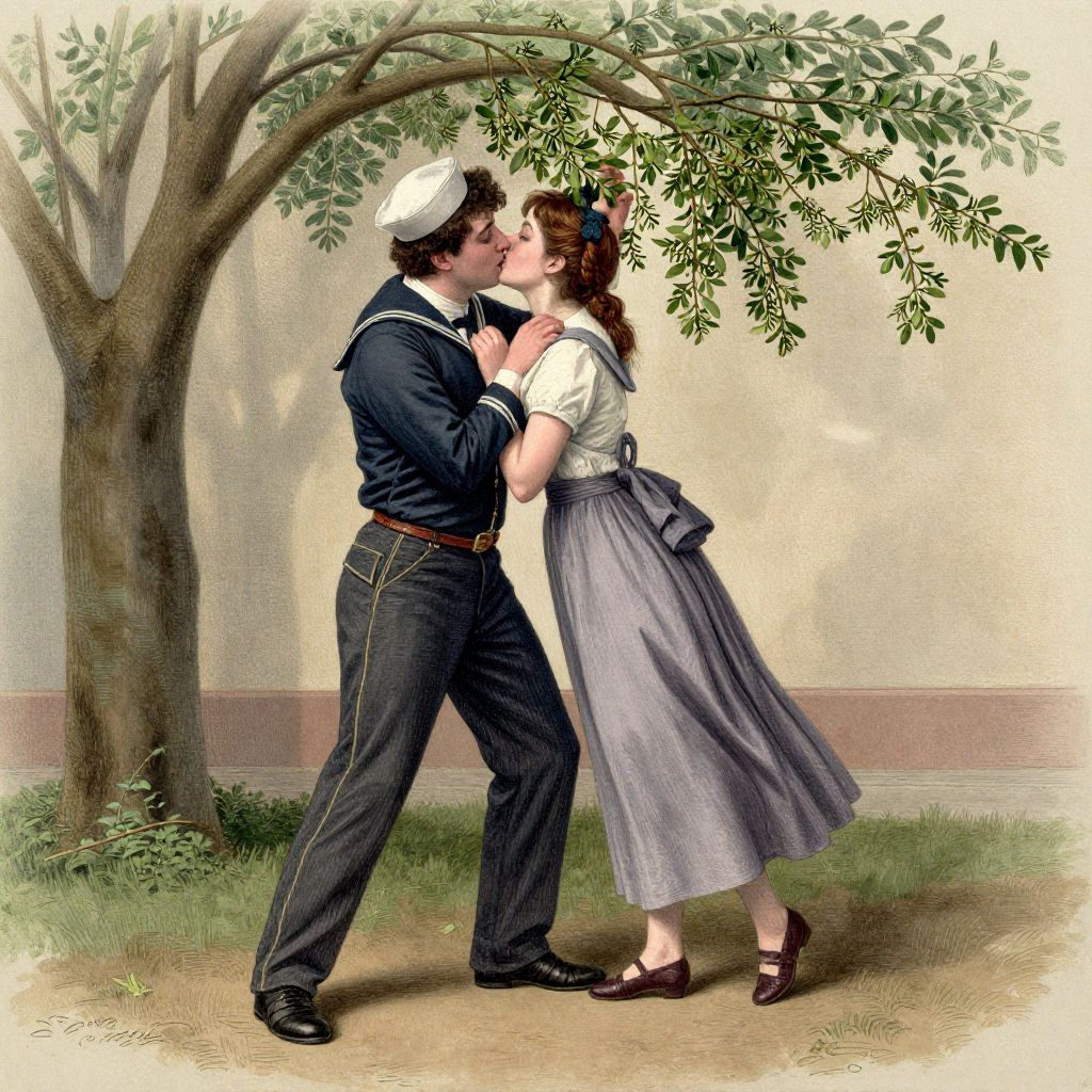 Circa 1890: A sailor tries to kiss a young woman under a sprig of mistletoe. William Small.