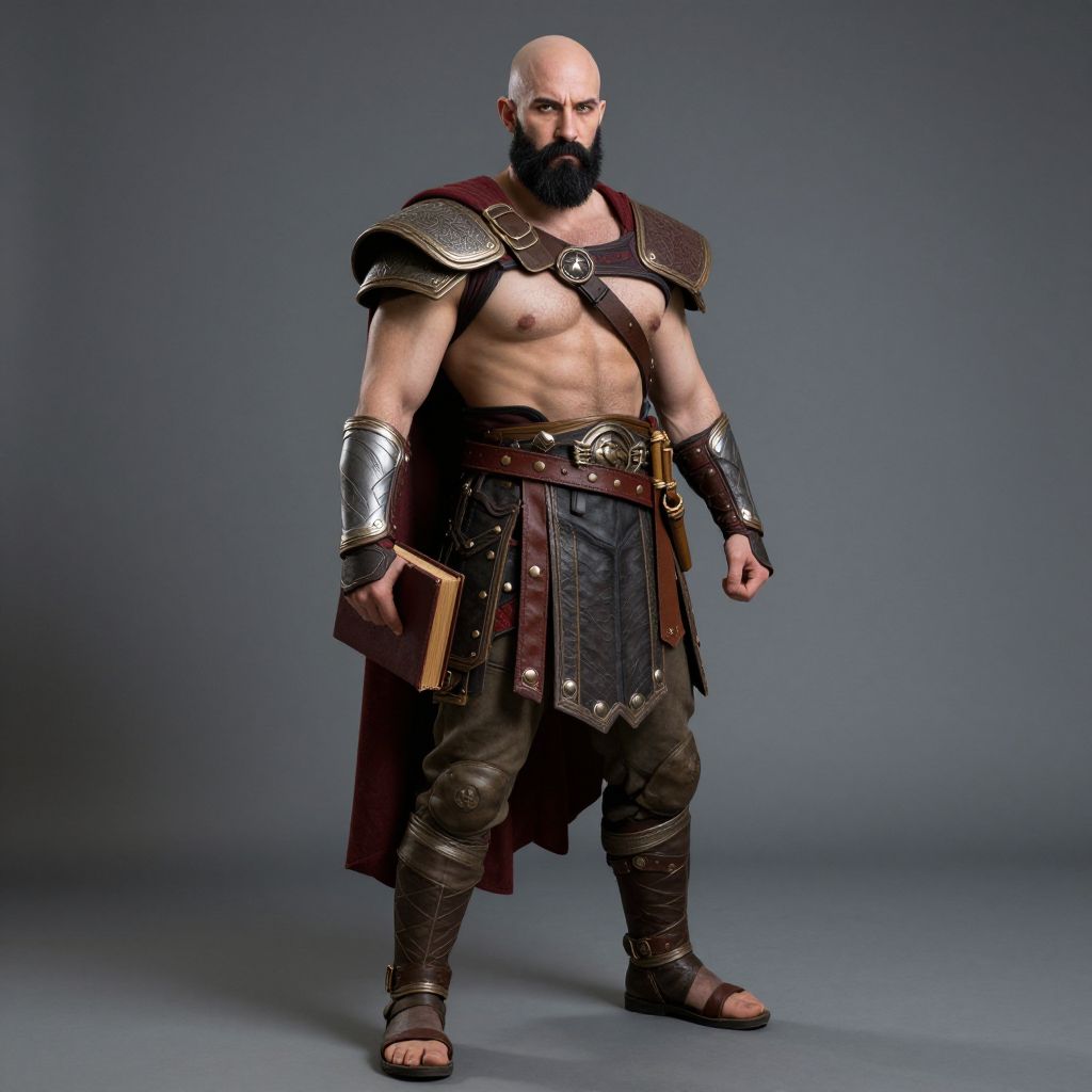 Photograph of a muscular, bald, bearded man in ancient Roman-style armor, holding a book, with a stern expression, against a gray gradient