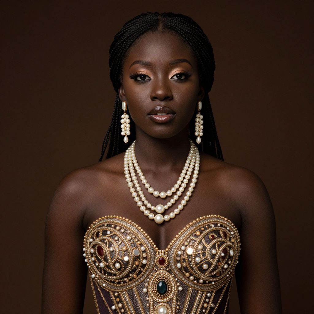 Photograph of a dark-skinned African woman with long braided hair, wearing an elaborate, gold-embellished strapless gown with intricate beading and sequins. She adorns herself with multiple layers of white pearl necklaces and large, dangling white pearl earrings. Her makeup is glamorous, featuring dark eyeliner and glossy pink lips. The background is a solid, dark brown, which contrasts with her bright attire and jewelry. She gazes directly at the camera with a poised, confident expression. The lighting highlights her smooth skin and the shimmering details of her outfit.