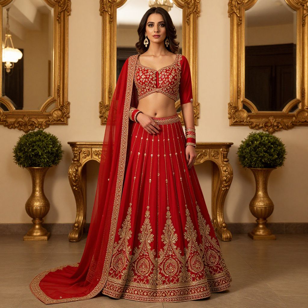 Elegantly poised woman wearing a vibrant red double-layer bridal gown with golden embellishments, featuring a front-open blouse and a flowing sharara, set against a luxurious interior with gold-framed mirrors, potted greenery, and warm lighting.