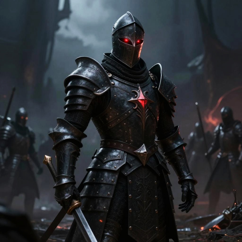 Black knight artwork in a mystical battlefield scene, glowing red eyes under a shadowy helmet, intricate armor designs with a dark aura, fantasy epic style.
