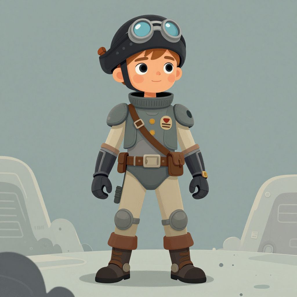 2050 s retro future 10 year boy old super scientest in space pirate mechanics costume. muted colors. childrens book layout by jean - baptiste monge,!!!!!!!!!!!!!!!!!!!!!!!!!!!!!!
