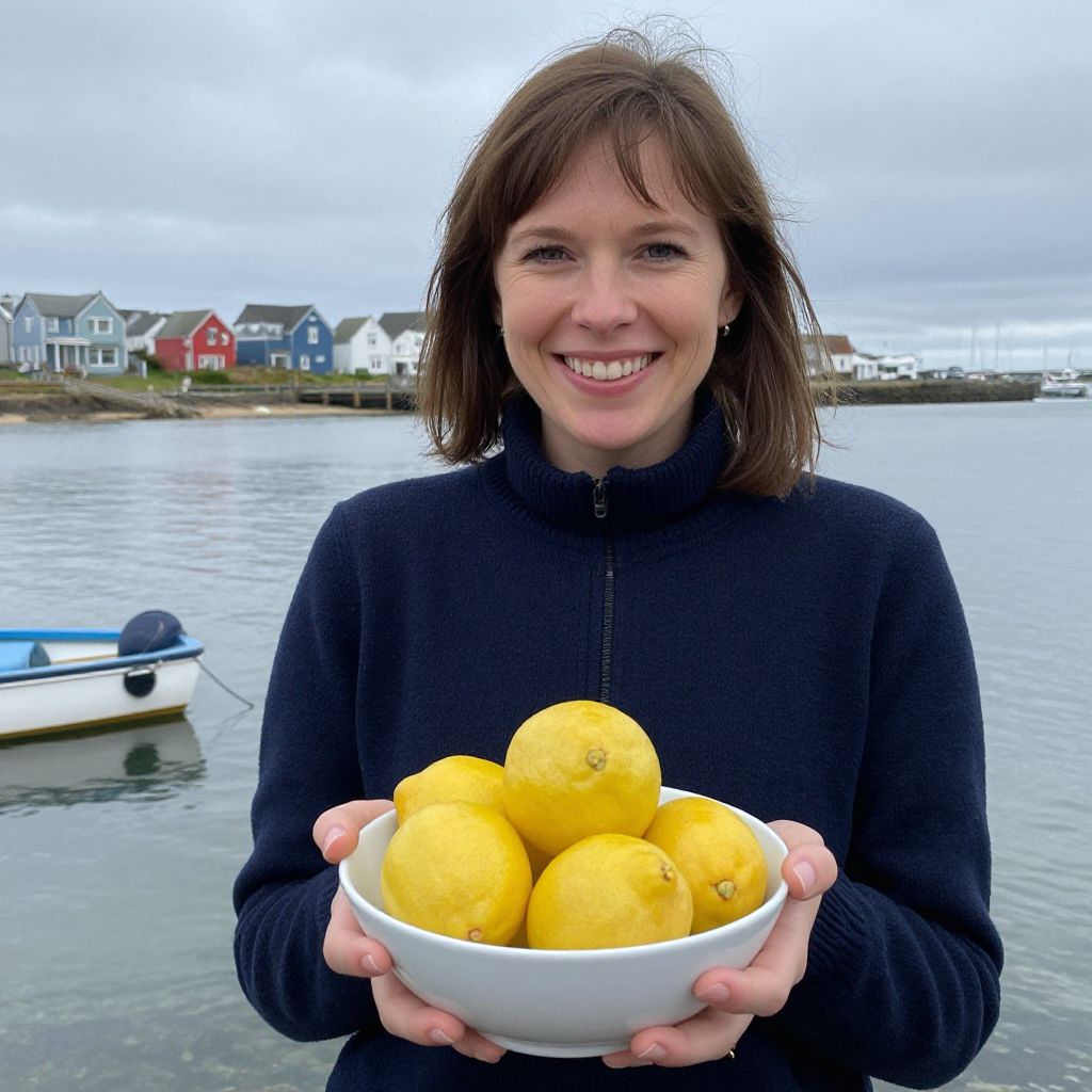 Smiling woman holding a white bowl filled with four bright yellow lemons, standing by the waterfront in Plymouth, with a small boat and houses visible in the background.