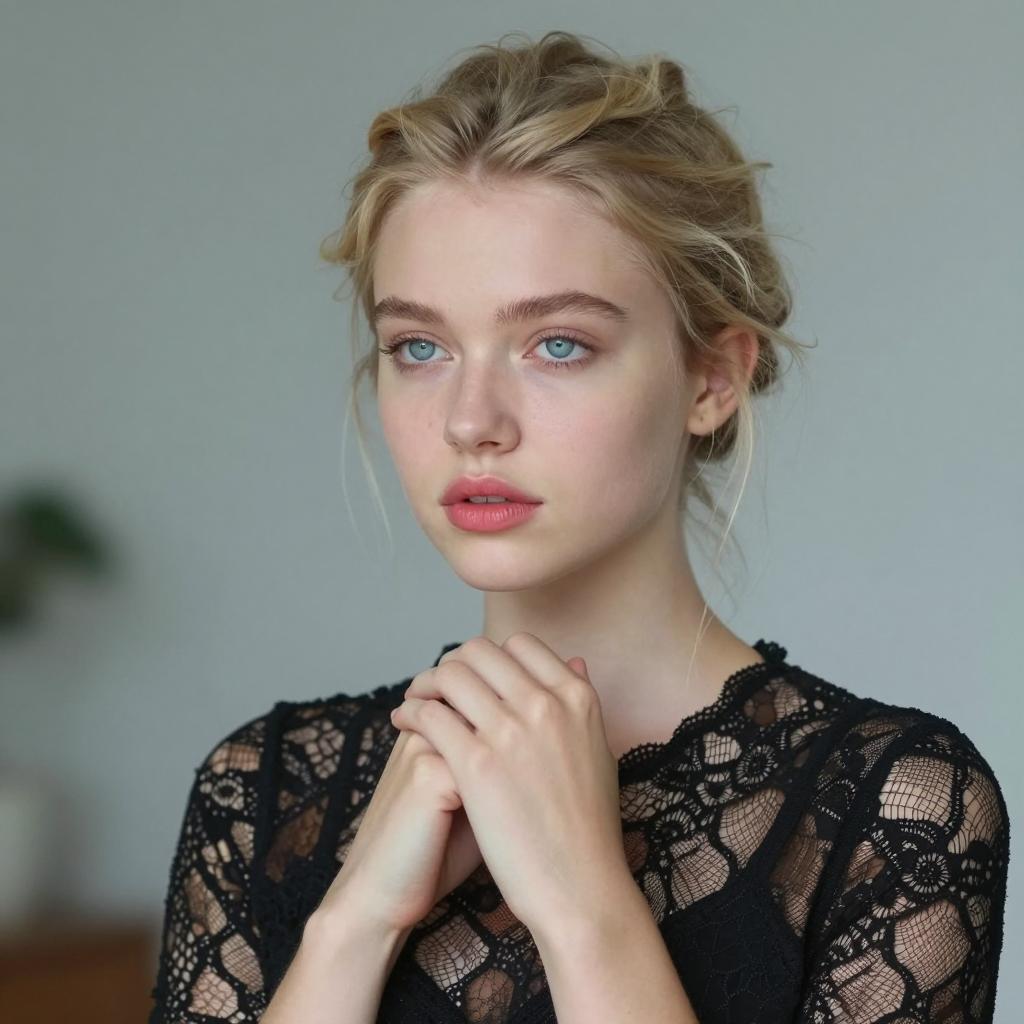 Digital illustration of a beautiful blonde woman with blue eyes, looking over her shoulder. She has wavy hair in a messy updo, a white off-shoulder top, and soft pink lips. Background has blurred water and plants. Light reflects off her hair. She has a serious expression. Light and shadow highlight her smooth skin.