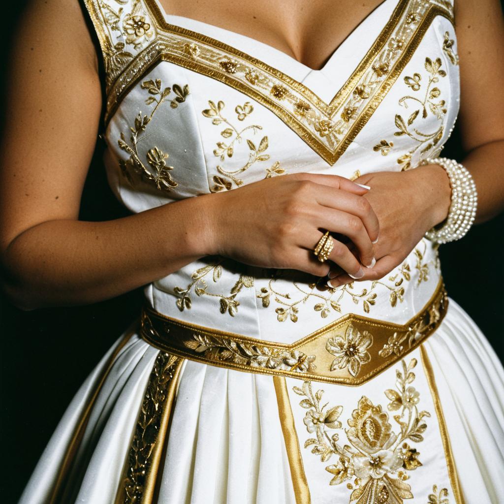 Traditional Wedding Outfit Woman, a close up of a woman in a white and gold dress