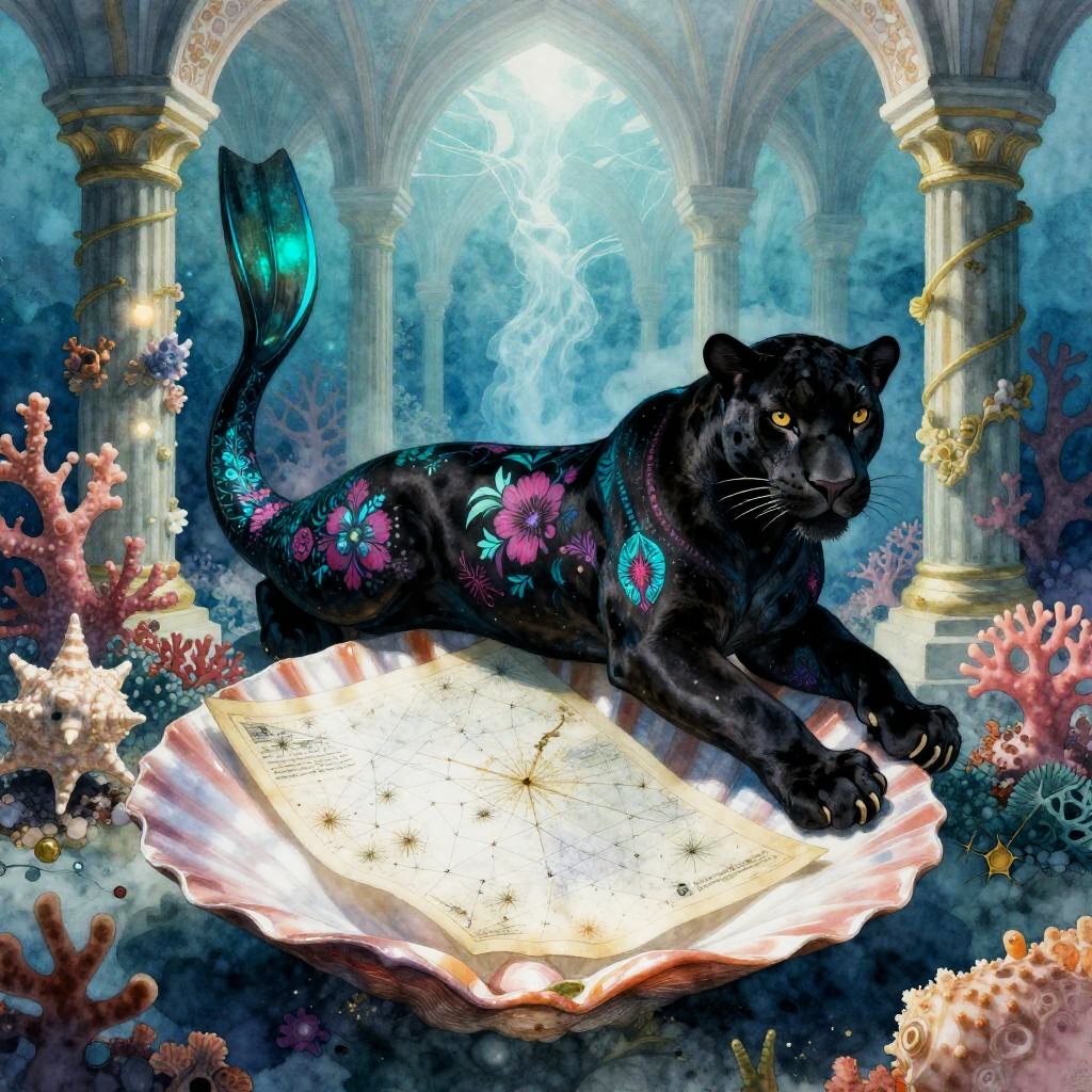 A merfolk cartographer mapping constellations on a seashell chart in a bioluminescent coral cathedral, inspired by Art Nouveau. Featuring a majestic black panther with electric teal and magenta highlights and intricate floral motifs, lounging on coral columns. The artwork showcases exceptionally high resolution and clarity, immersed in a dazzling watercolor style with bright, iridescent hues in 32k detail.