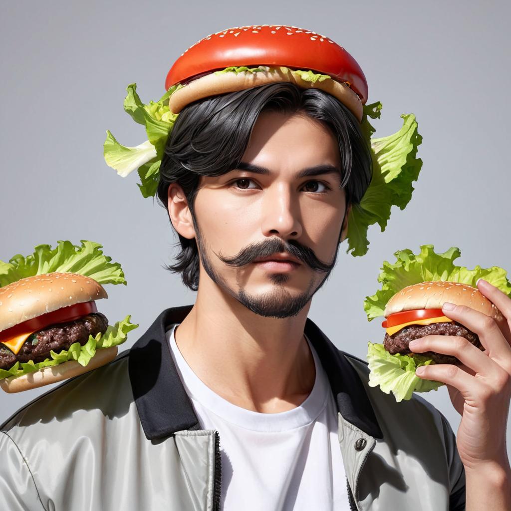 Portrait of a man with dark hair and a beard, wearing a gray jacket with a small tomato pinned on it. He has a hamburger with lettuce on his head and is holding a burger with a large tomato and lettuce instead of a beef patty. The background is plain gray.