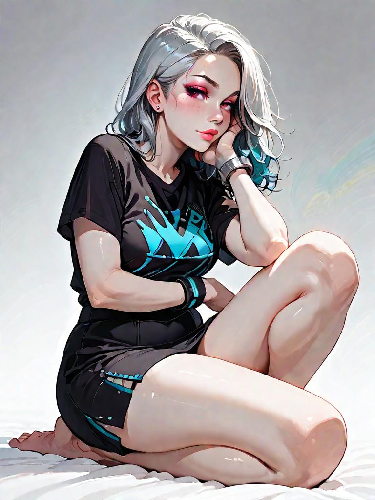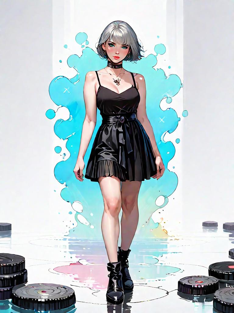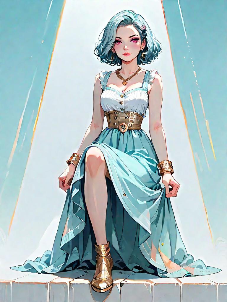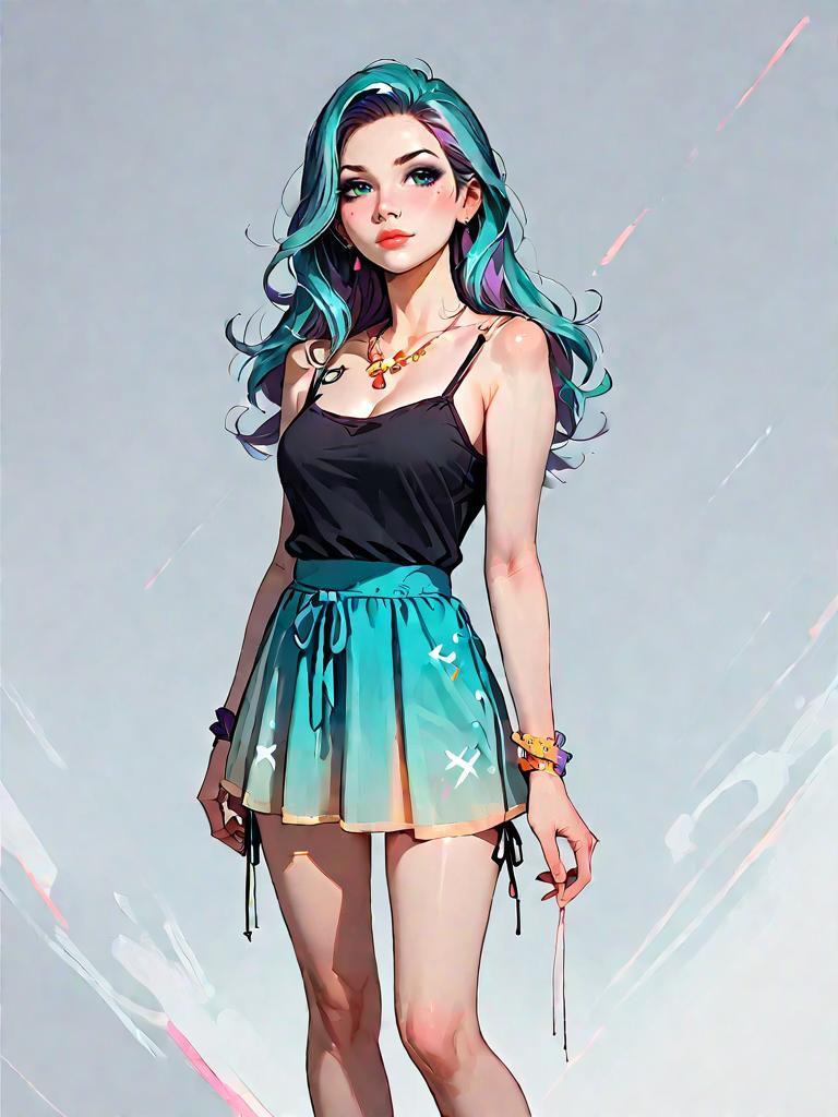 1girl, source_comics, realistic face, full body shot, Woman, contemporary casual, lilac gingham two-piece set, strapless crop top, matching high-waist pencil skirt, midi length, white low-top sneakers, subtle necklace, studio background with high key lighting.