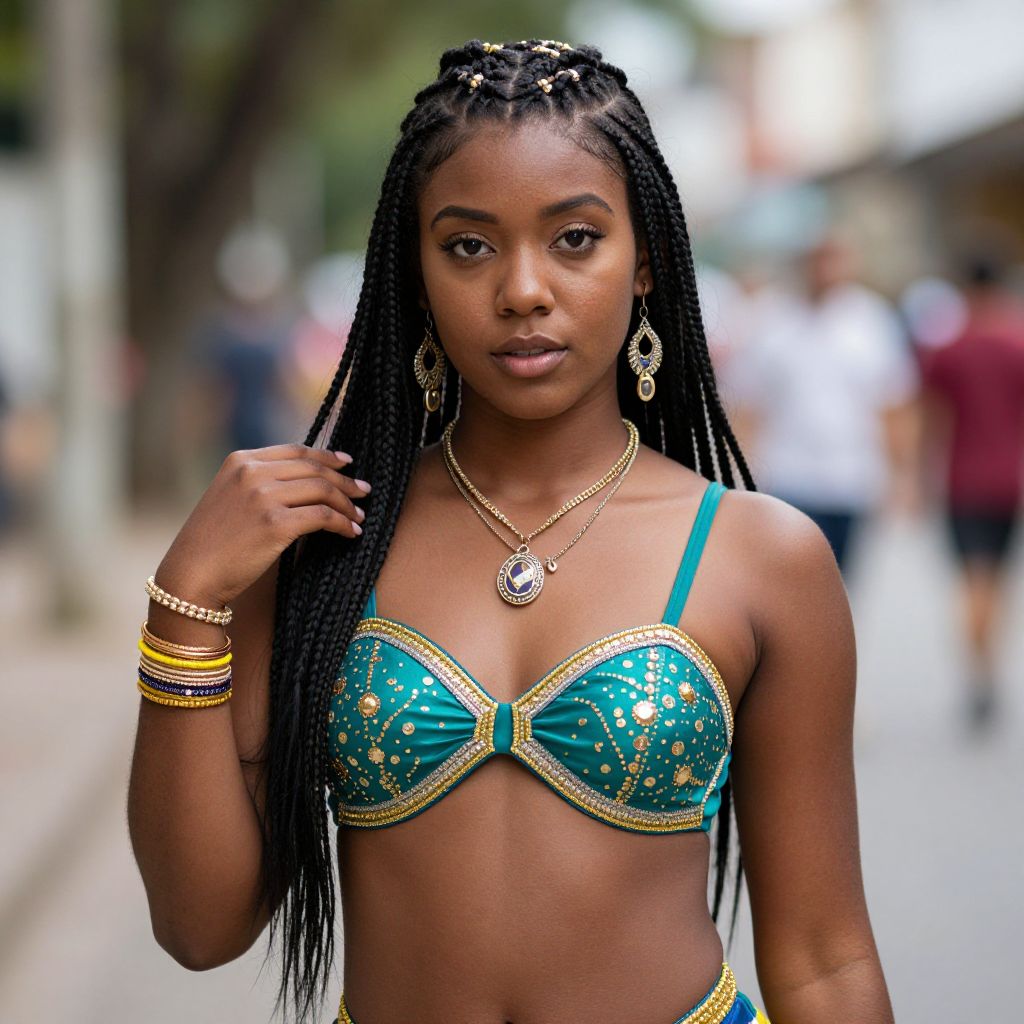 Photograph of a young Black woman with dark skin and long, intricately braided hair, standing on a city street. She wears a teal bra with gold embroidery and matching bottoms, adorned with gold bangles on her right wrist and a silver necklace with a circular pendant. Her large hoop earrings and confident gaze are prominent. The blurred background features people walking and greenery, suggesting an urban setting. The image is brightly lit with a focus on her upper body, highlighting her stylish outfit and accessories.