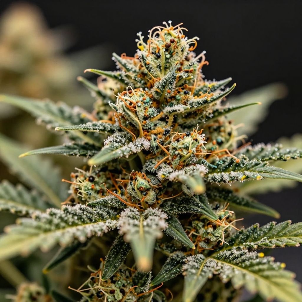 Close-up photograph of a cannabis plant's dense, clustered bud. The bud features green, serrated leaves covered in a fine, white, frosty trichome layer, giving it a textured, almost sparkly appearance. Tiny, orange-brown pistils protrude from the trichomes, adding contrast. The background is blurred and dark, emphasizing the detailed foreground. The lighting highlights the plant's intricate textures and colors, capturing the complexity and vibrancy of the cannabis plant.