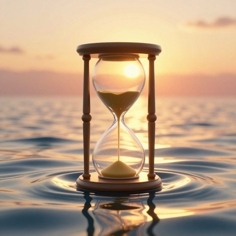 Photograph of a wooden hourglass with sand flowing, standing in calm water at sunset, creating golden reflections and ripples.
