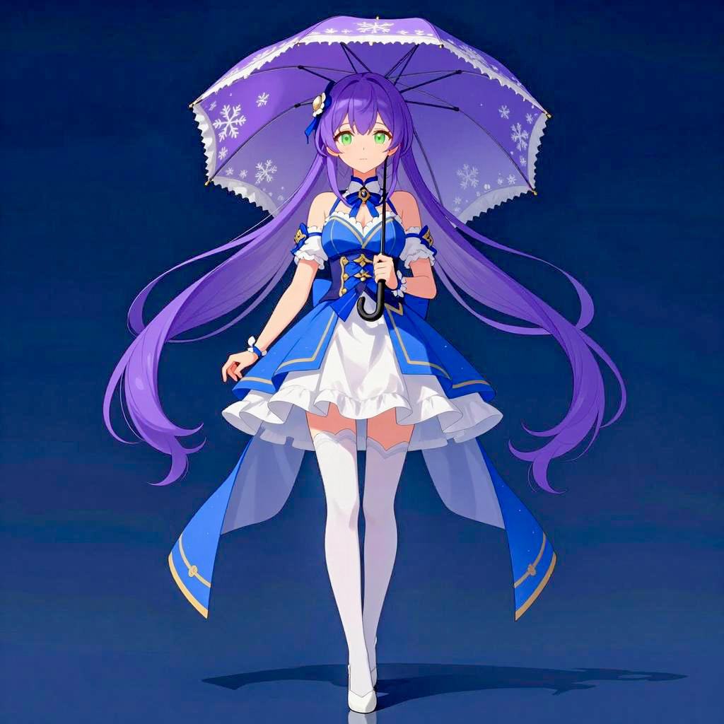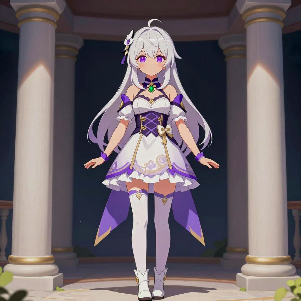 Digital illustration of an anime-style girl with long white hair and purple eyes. She wears a white and purple off-shoulder dress with lace-up corset, long sleeves, and thigh-high stockings. A green gemstone necklace adorns her neck. She stands on a circular stone platform between two white columns. She has a gentle smile and her arms are slightly outstretched. A purple ribbon with a white flower is in her hair. She wears white shoes. The background is dark.
