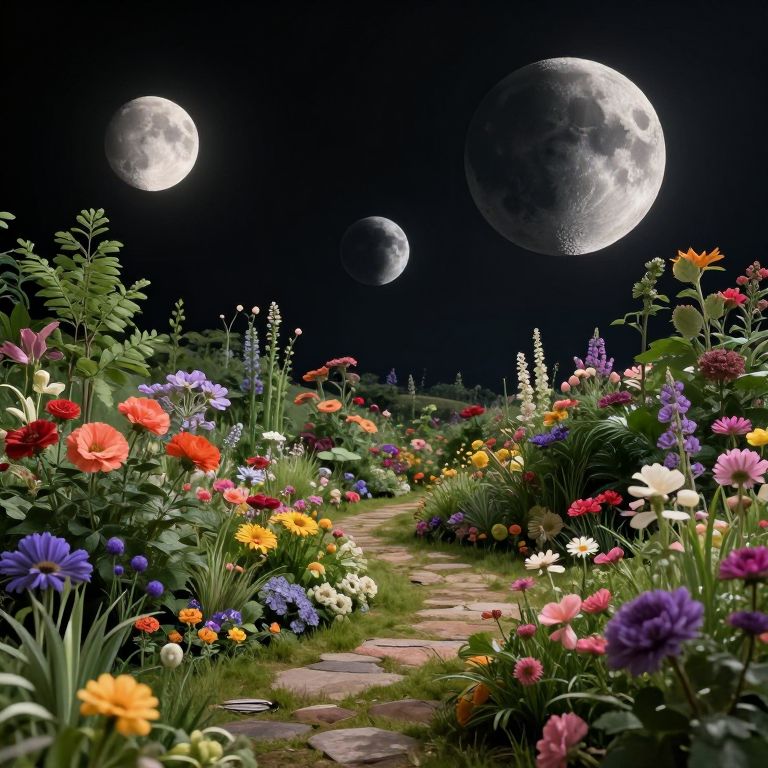 Photograph-style digital art of a vibrant, moonlit garden with colorful flowers, a stone path, and three large, luminous moons in the dark