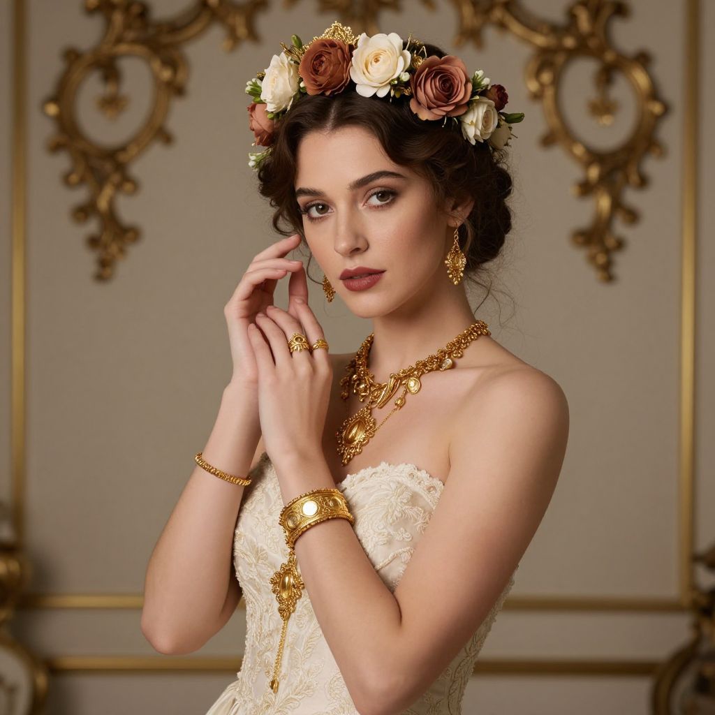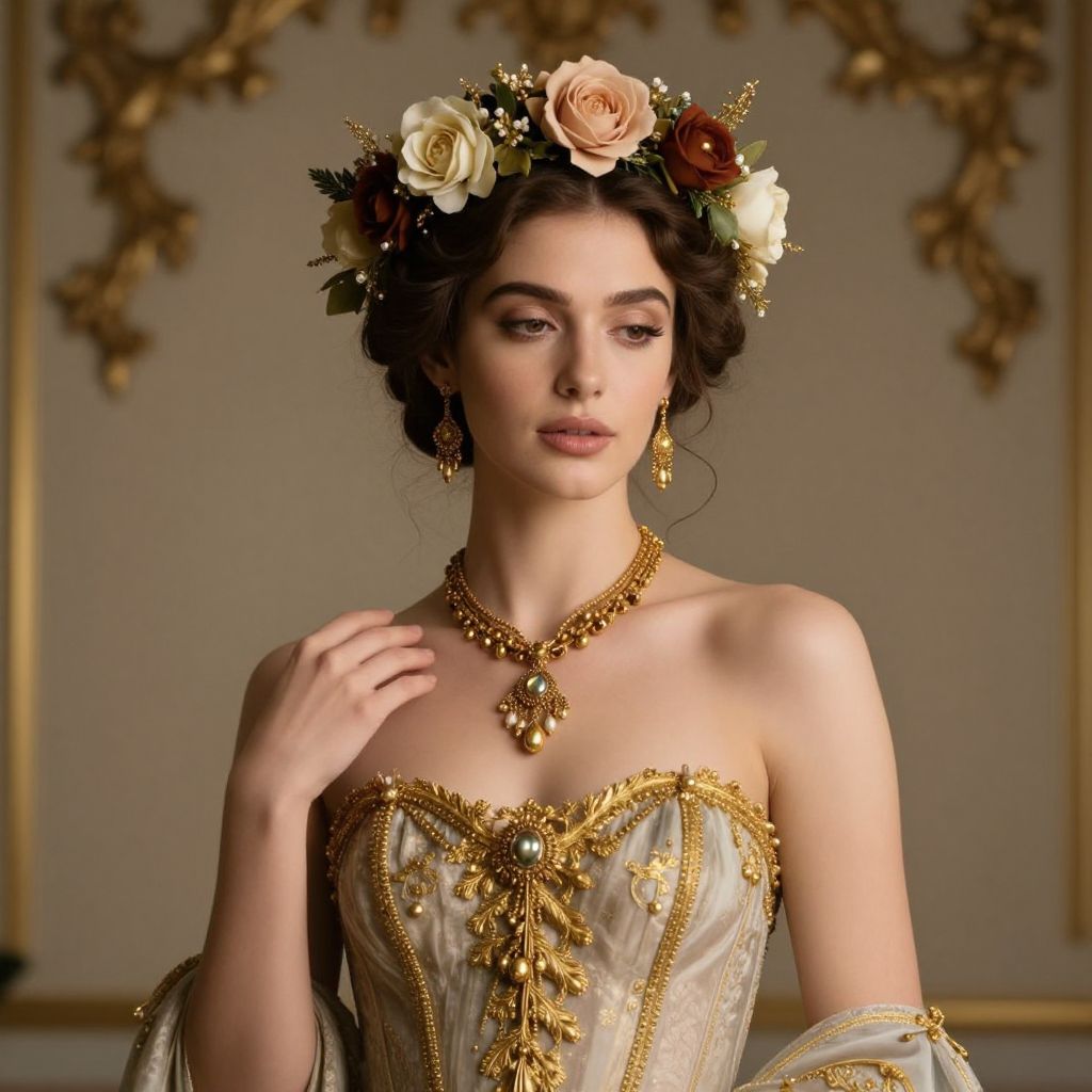 Photograph of a fair-skinned woman with dark, wavy hair adorned with a floral crown featuring white, peach, and red roses. She wears an elegant, off-shoulder, cream-colored gown with gold embroidery and a matching ornate necklace with a large pendant. Her right hand gently touches her collarbone. The background is a softly lit, ornate room with gold floral wall decorations. Her makeup is subtle, highlighting her delicate features. The overall style is vintage and regal, evoking a classical, romantic aesthetic.