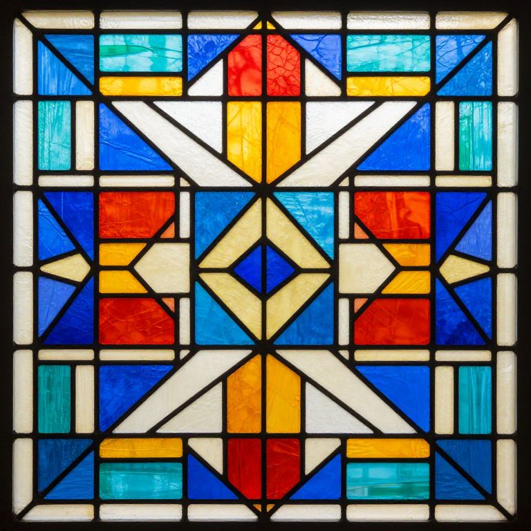 Intricately crafted easy geometric stained glass patterns emphasizing sharp edges and clean lines, with a focus on symmetry and repetition, using a lively color palette of primary colors, illuminated to showcase the translucency and depth of each colored glass fragment, artistic and bright.