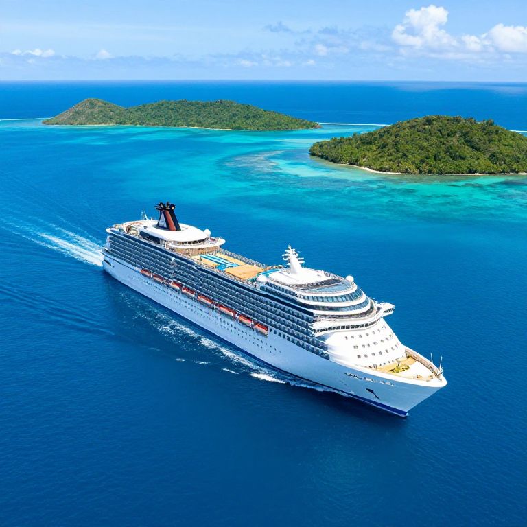Photograph of a large white cruise ship with a red funnel sailing through vibrant blue ocean, surrounded by green islands under a partly cloudy sky.