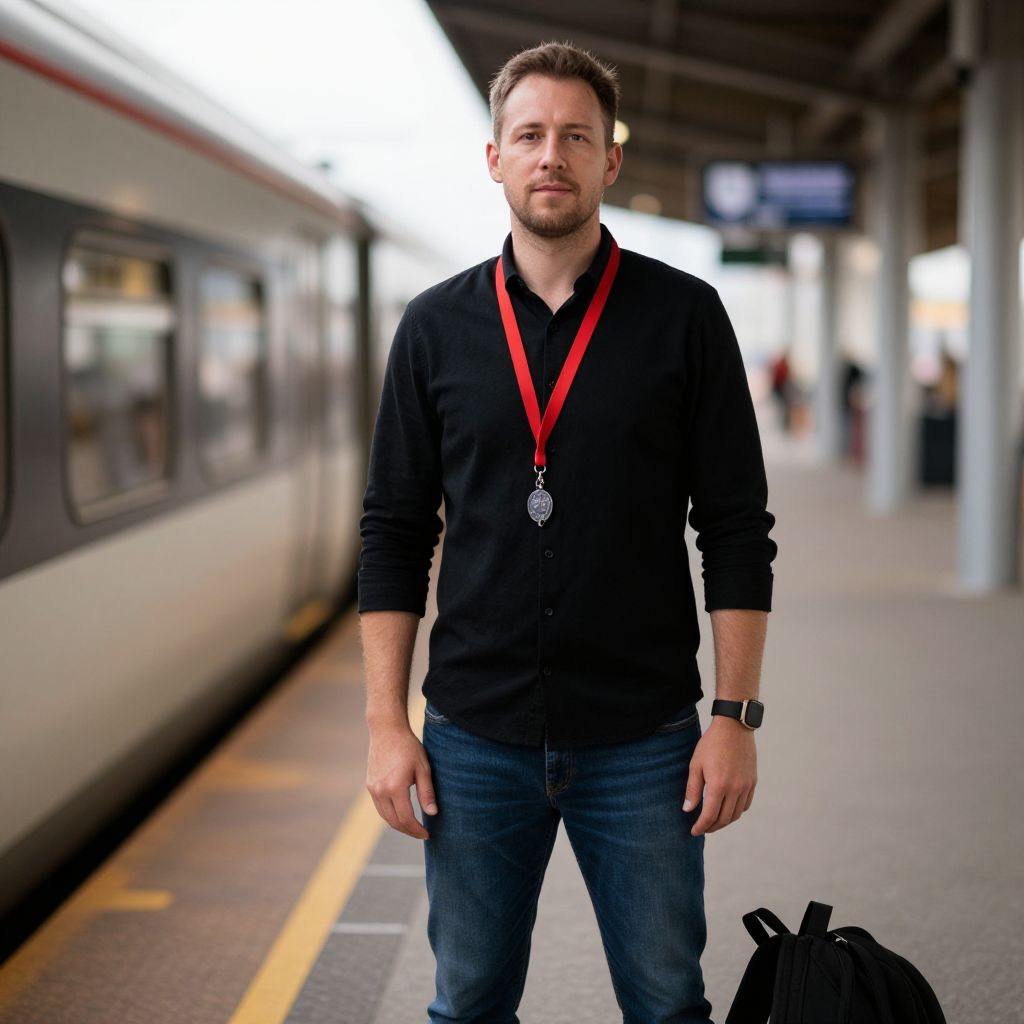 Man with short brown hair, wearing a black shirt and blue jeans, with a red lanyard around his neck. He is standing on a platform with a train on the left side and a black backpack on the right side.