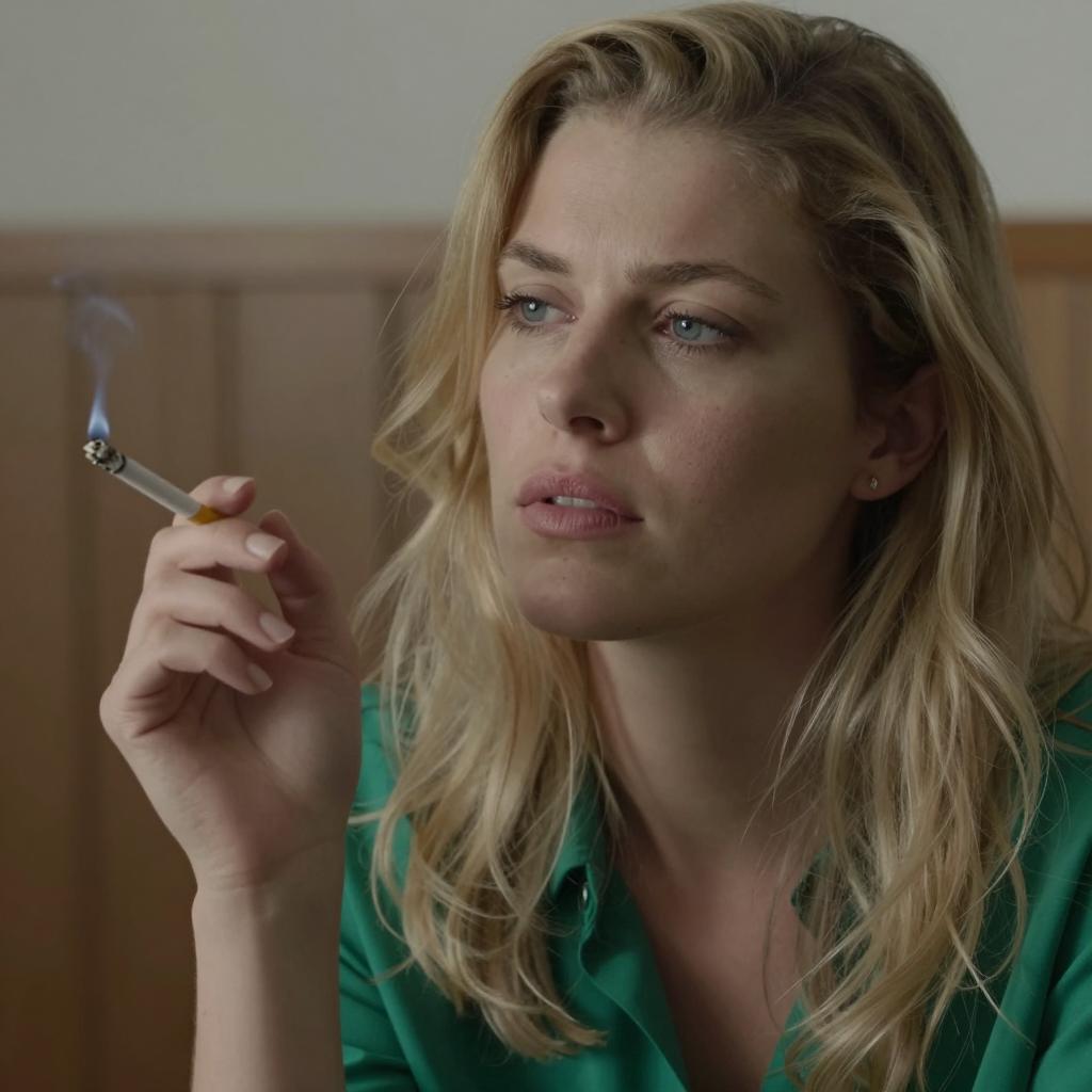 Close-up photograph of a blonde woman with wavy hair, wearing a green top, holding a lit cigarette in her right hand. Her face is serious, looking to the side. Blurred objects and a wooden panel are in the background.
