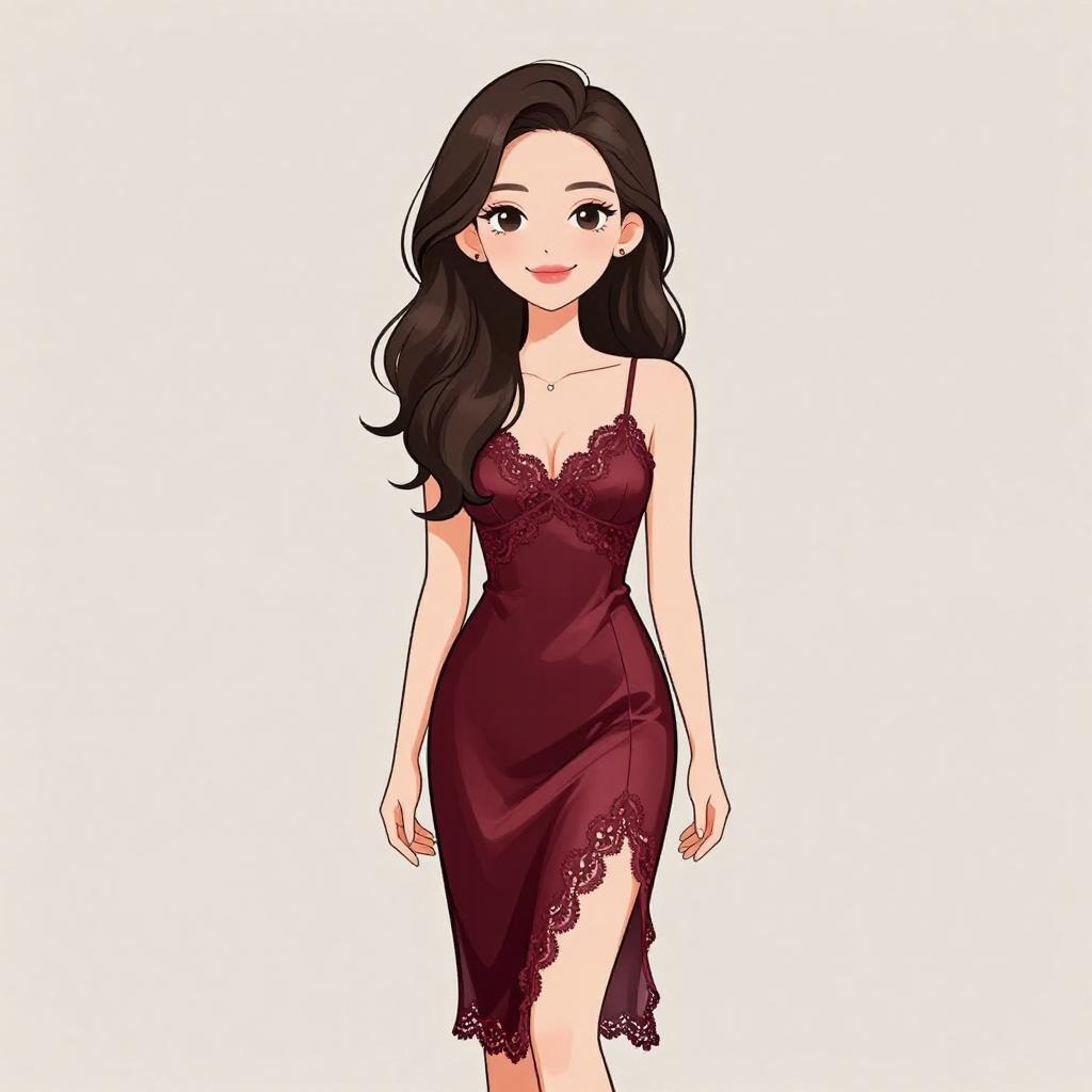 This is a digital anime-style drawing of a young woman with long, wavy black hair and fair skin. She has large, expressive brown eyes and a small, delicate nose. She is wearing a form-fitting, strapless red satin dress that accentuates her slender figure and small breasts. The dress features a subtle floral pattern on the right side. She stands against a plain white background, looking directly at the viewer with a slight smile. The drawing uses bold lines and vibrant colors, typical of anime art.