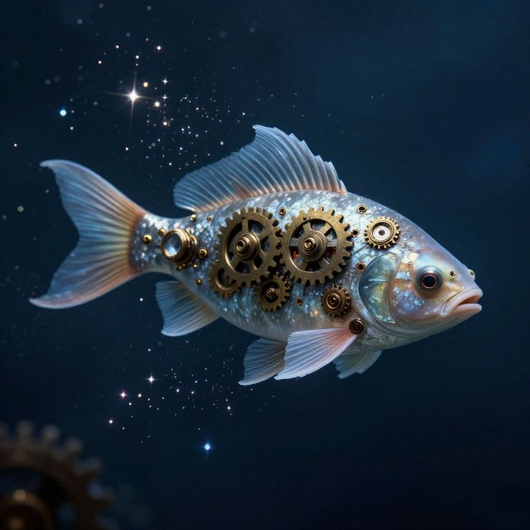 Photograph of a glowing, metallic fish with gears embedded in its body, floating in a dark blue underwater scene dotted with stars.
