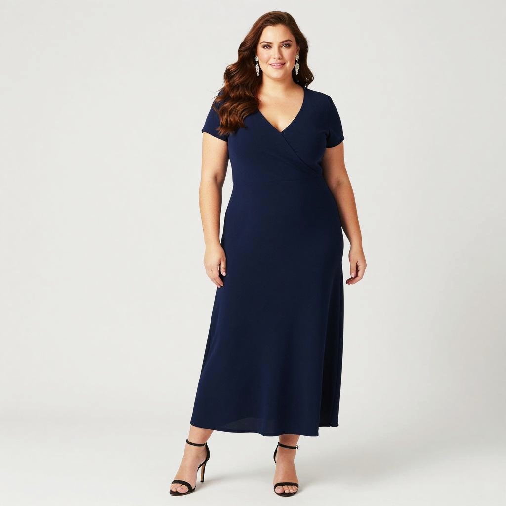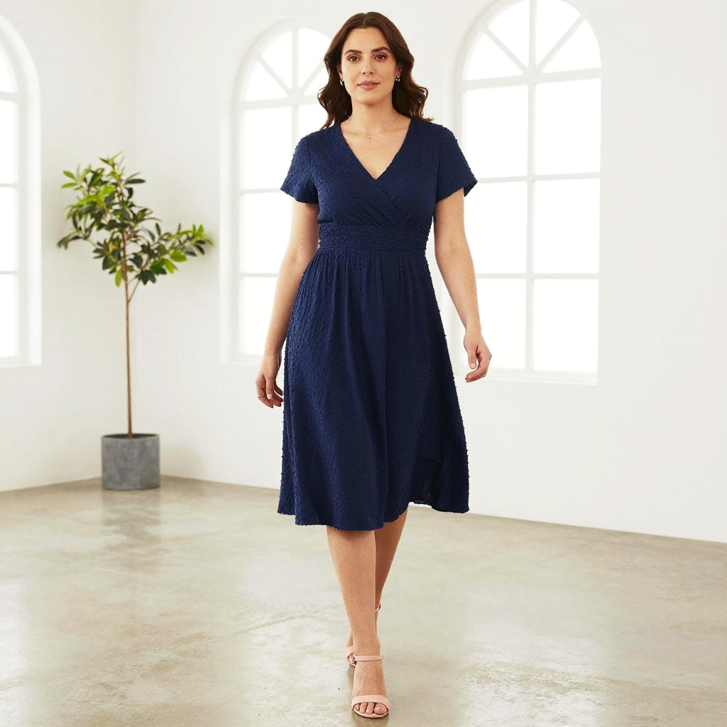 Photograph of a woman walking indoors, wearing a navy blue, V-neck, short-sleeved, knee-length dress with a textured, pleated skirt. She has wavy brown hair and is wearing pink, open-toe heels. The background features a bright, white room with large, arched windows and a green plant to the left. The floor is a light gray, textured concrete.