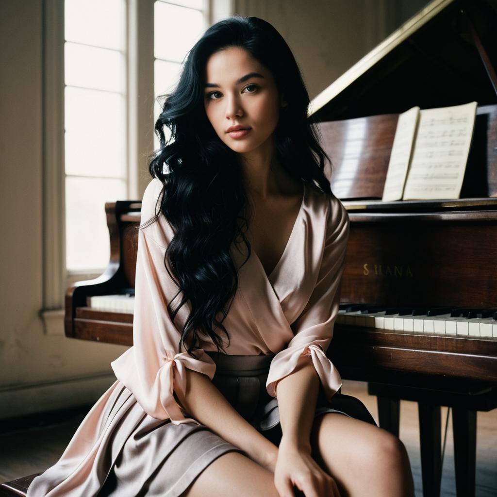 A stunning woman with long wavy black hair, soft makeup, full lips, and smooth skin, seated beside a dusty piano in an empty hall, wearing a silky blush wrap-around blouse with mini skirt, warm natural light casting soft shadows.
