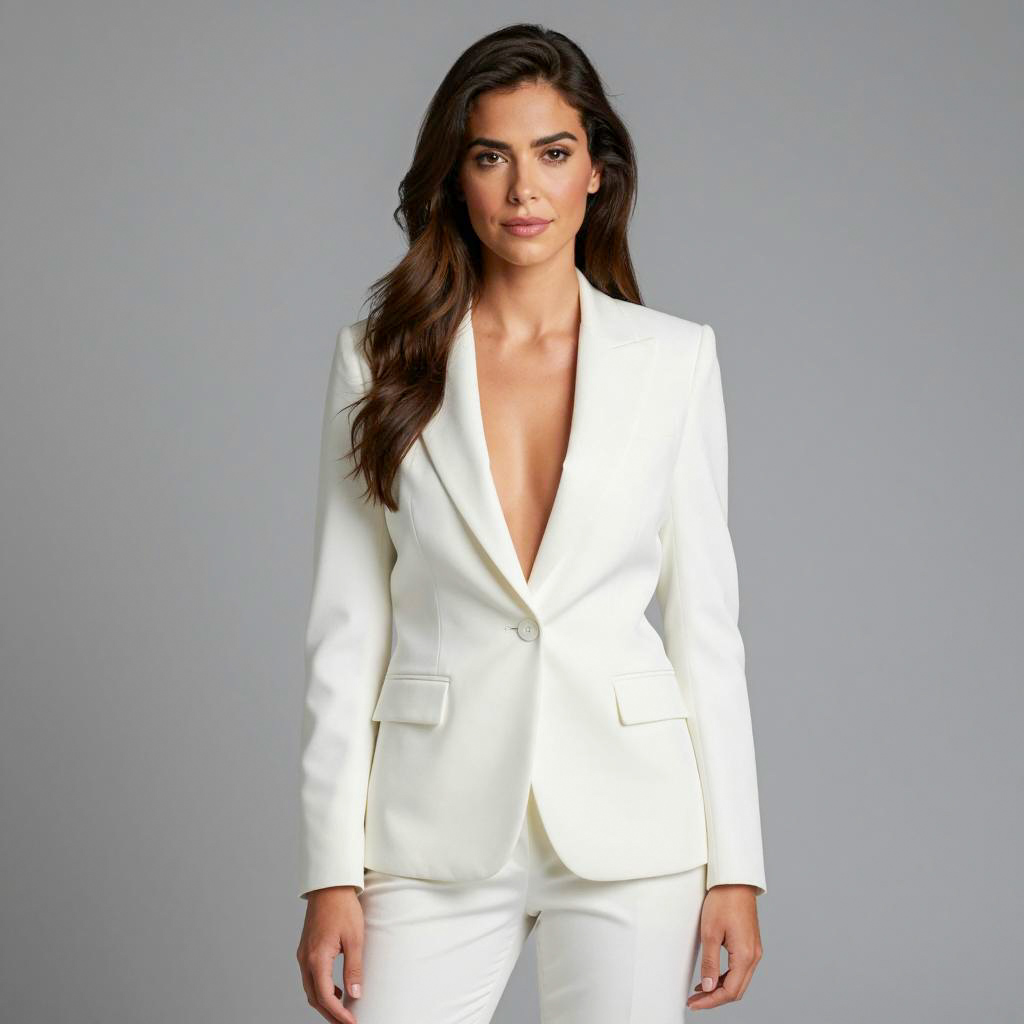 Woman with long dark brown hair, wearing a white blazer with a deep V-neck, white pants, standing against a plain gray background. Hand in blazer pocket. Neutral expression. Simple, professional attire. Light skin, dark eyebrows, subtle makeup. Full-body shot, front view. Photographic image.