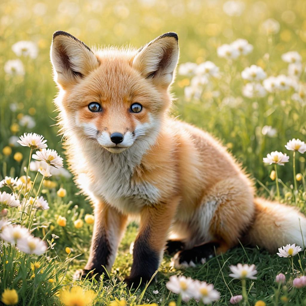 A close-up of a playful baby red fox with soft, fluffy fur, sitting among blooming daisies and wildflowers in a sunlit meadow. The fox's warm orange and creamy hues are highlighted by gentle natural lighting, creating a serene and inviting atmosphere.