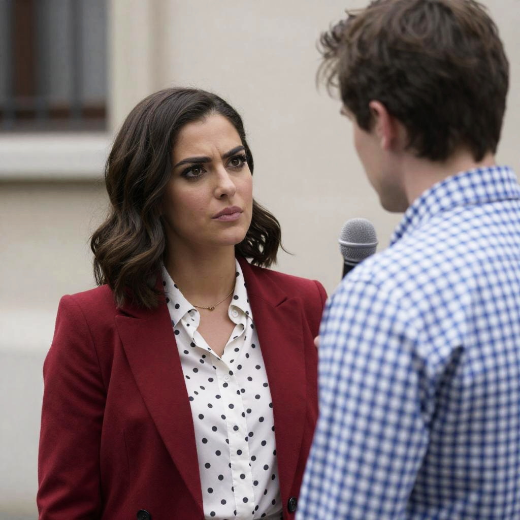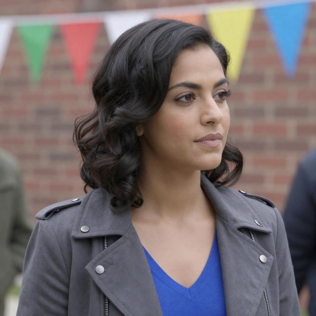 Woman with dark, wavy hair in a side braid, wearing a gray jacket over a blue top, looking to the side. Background has a blurred brick wall and colorful flags. Casual outdoor setting. Medium close-up.