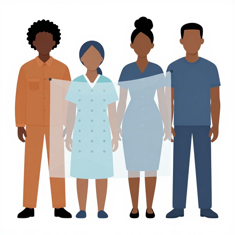 Flat illustration of four Black individuals standing side by side with a translucent organza fabric overlay across their torsos. Two males and two females are depicted, wearing casual and semi-formal clothing in solid colors, set against a solid white background. The image represents conceptual themes related to false narratives and public health issues affecting Black communities in the United States.
