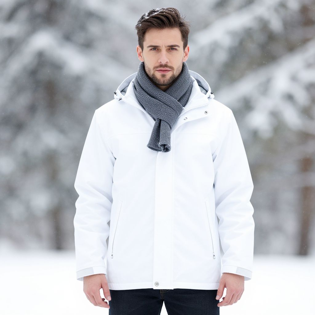 "Winter Shirts Man Costume, man in a white jacket and a scarf standing in the snow"