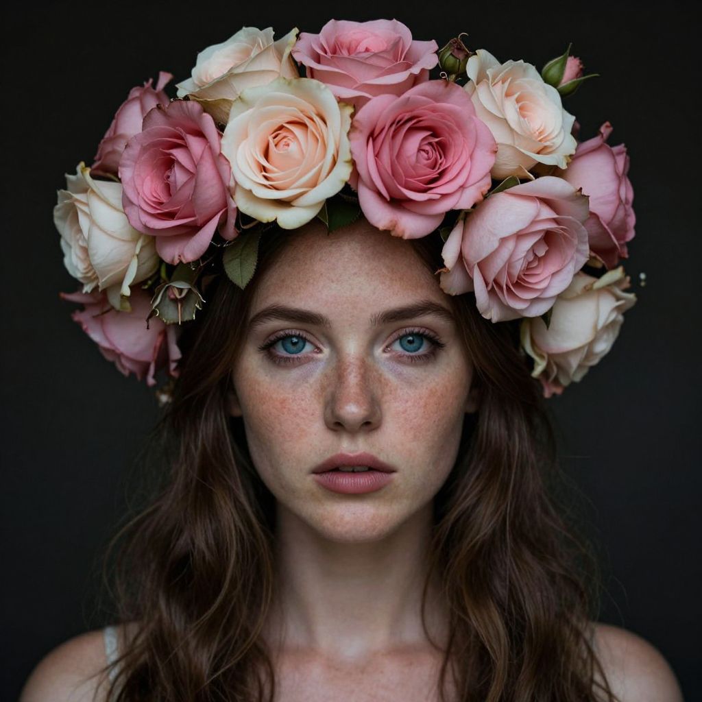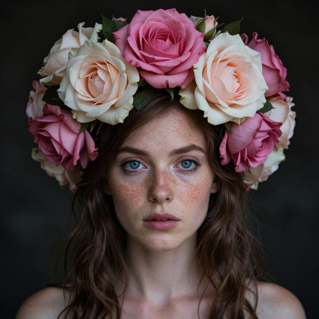 Photograph of a young woman with fair skin and blue eyes, framed by a dark background. She has long, wavy brown hair and wears a floral crown of pink, white, and blush roses. Her face is adorned with freckles, and she gazes directly into the camera with a neutral expression. The lighting highlights her natural beauty and the delicate textures of the roses. The image has a dreamy, ethereal quality, emphasizing the contrast between her soft features and the dark background.
