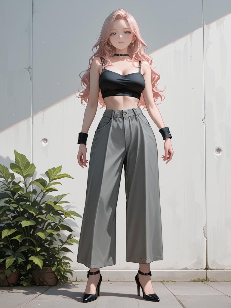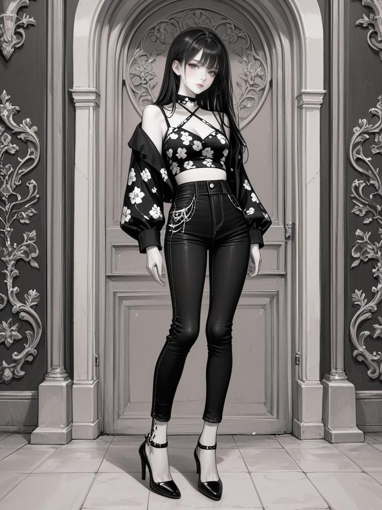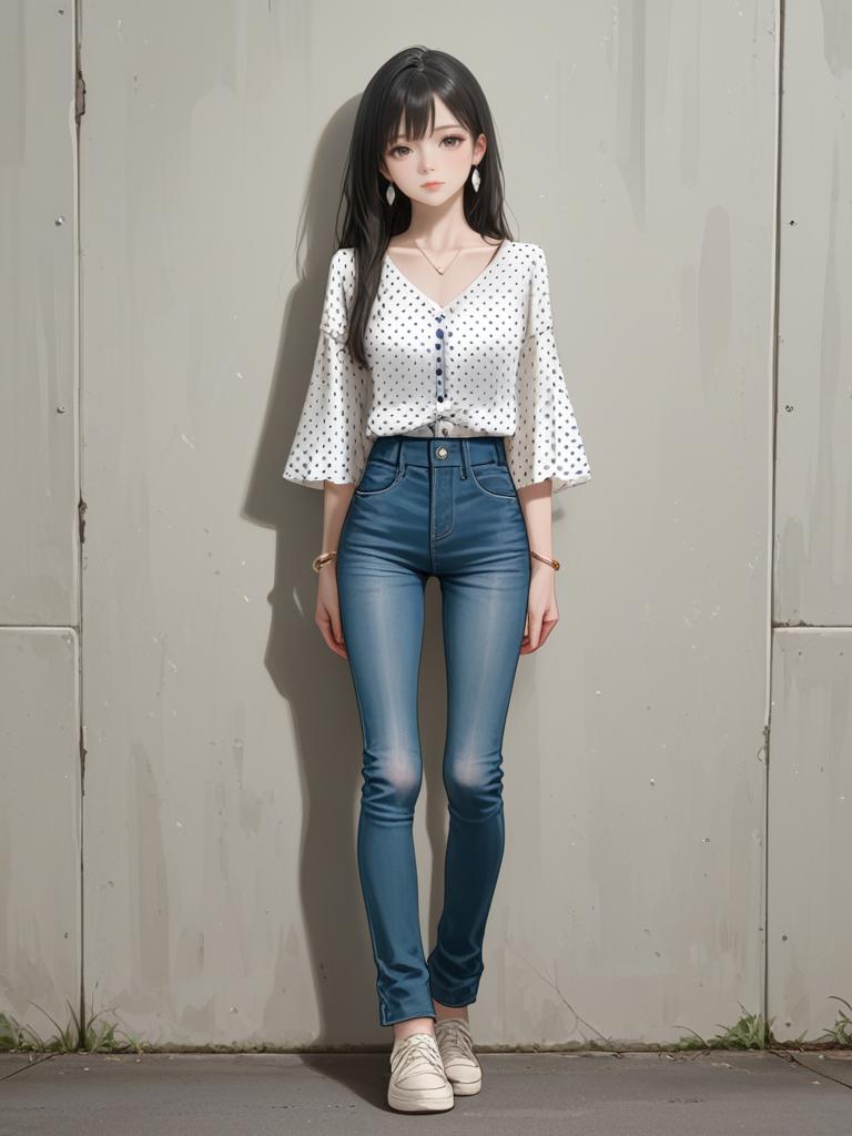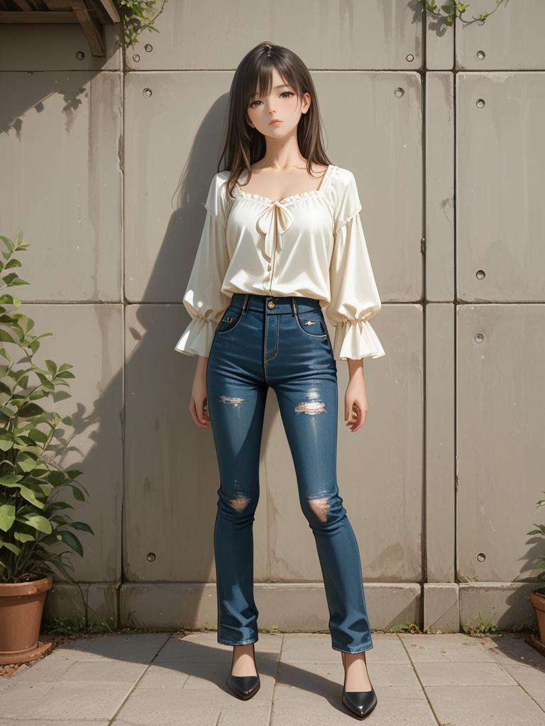 1girl, realistic face, full body shot, Woman, chic, faux fur open-front vest in white, gray long-sleeve fitted top, medium-blue skinny jeans, wide-brimmed black felt hat, silver pendant necklace.