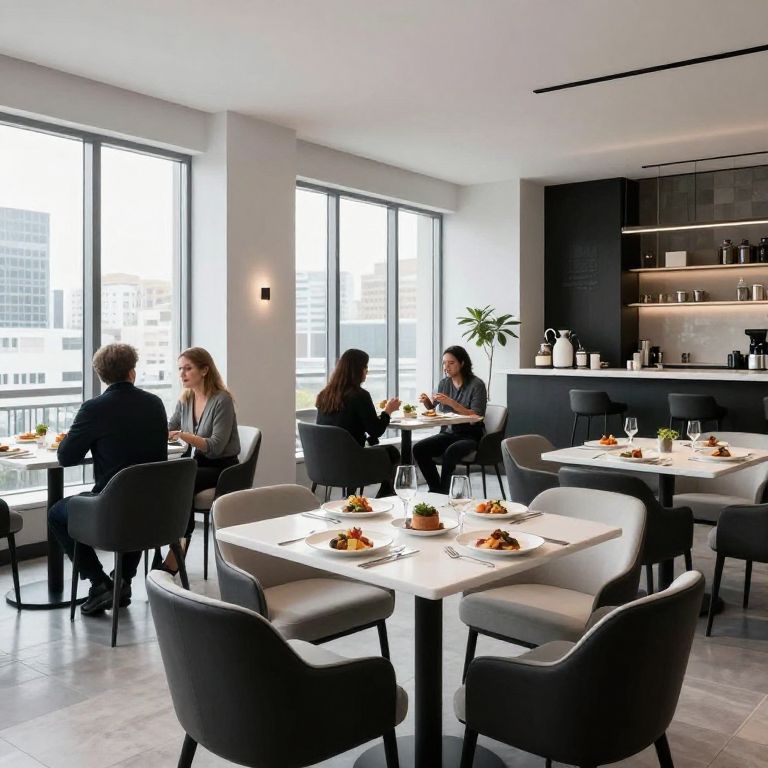 Restaurante interior with modern minimalist design, sleek black and white furniture, large windows revealing cityscape, patrons engaged in conversation, artistic food presentation on plates, clean lines and natural light, sophisticated and contemporary mood.