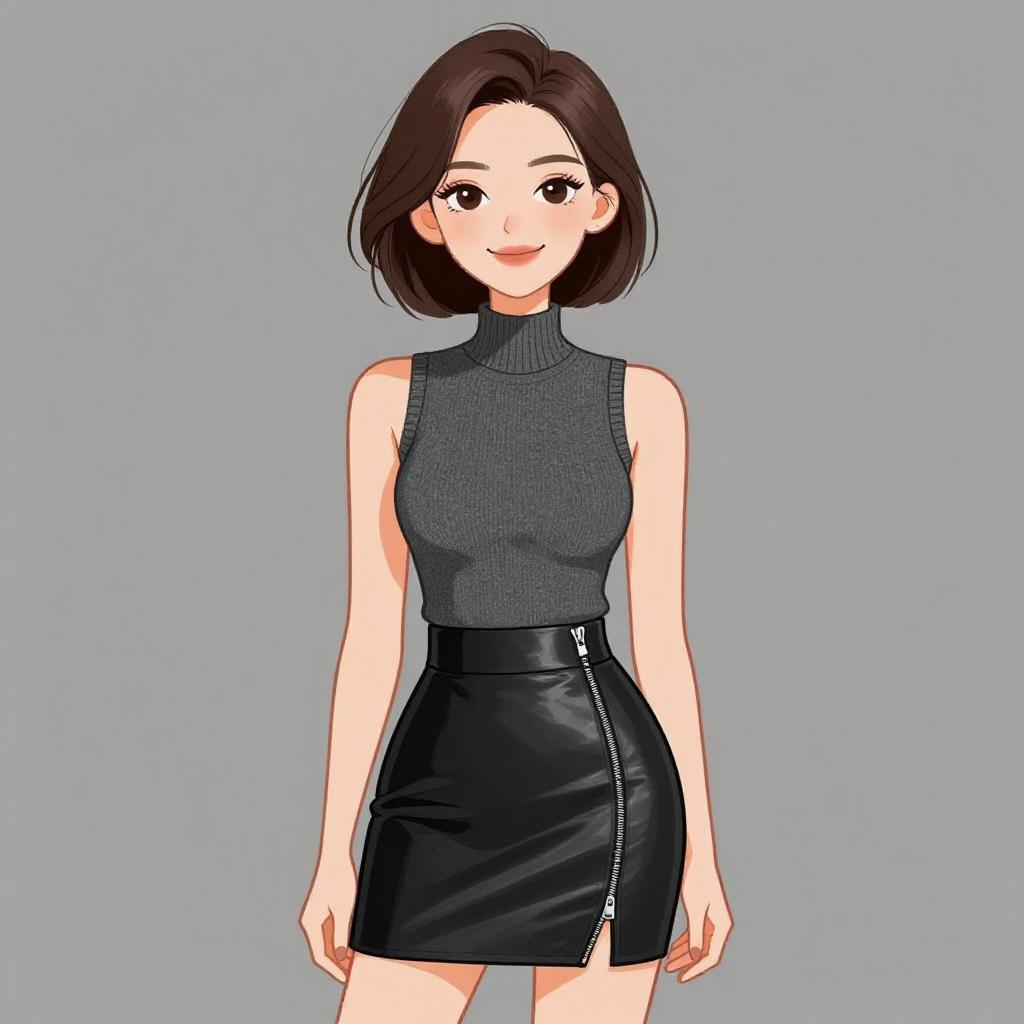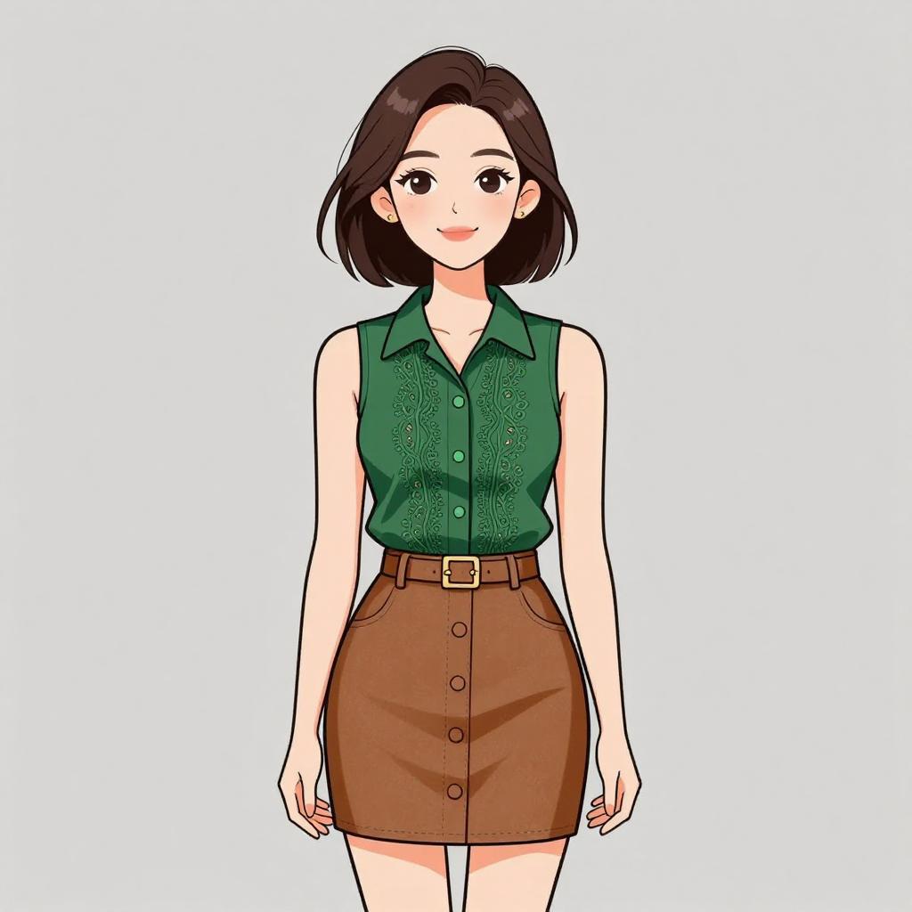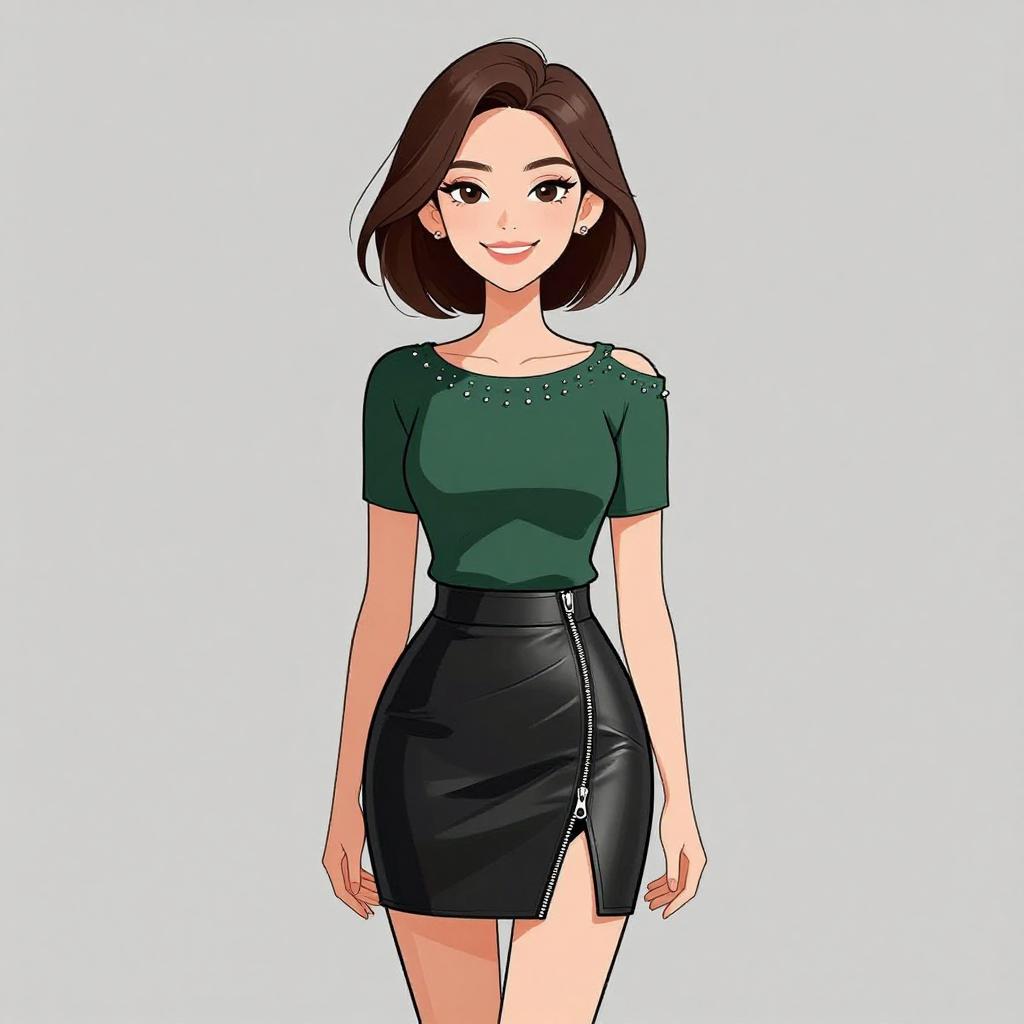 Digital illustration of a smiling woman with short brown hair wearing a dark green boat neck blouse featuring open shoulder detail and metallic bead embellishments. She pairs the blouse with a fitted black faux leather mini skirt that has an asymmetrical wrap design and a central zipper. The woman has a pleasant facial expression and is posed against a plain grey background.