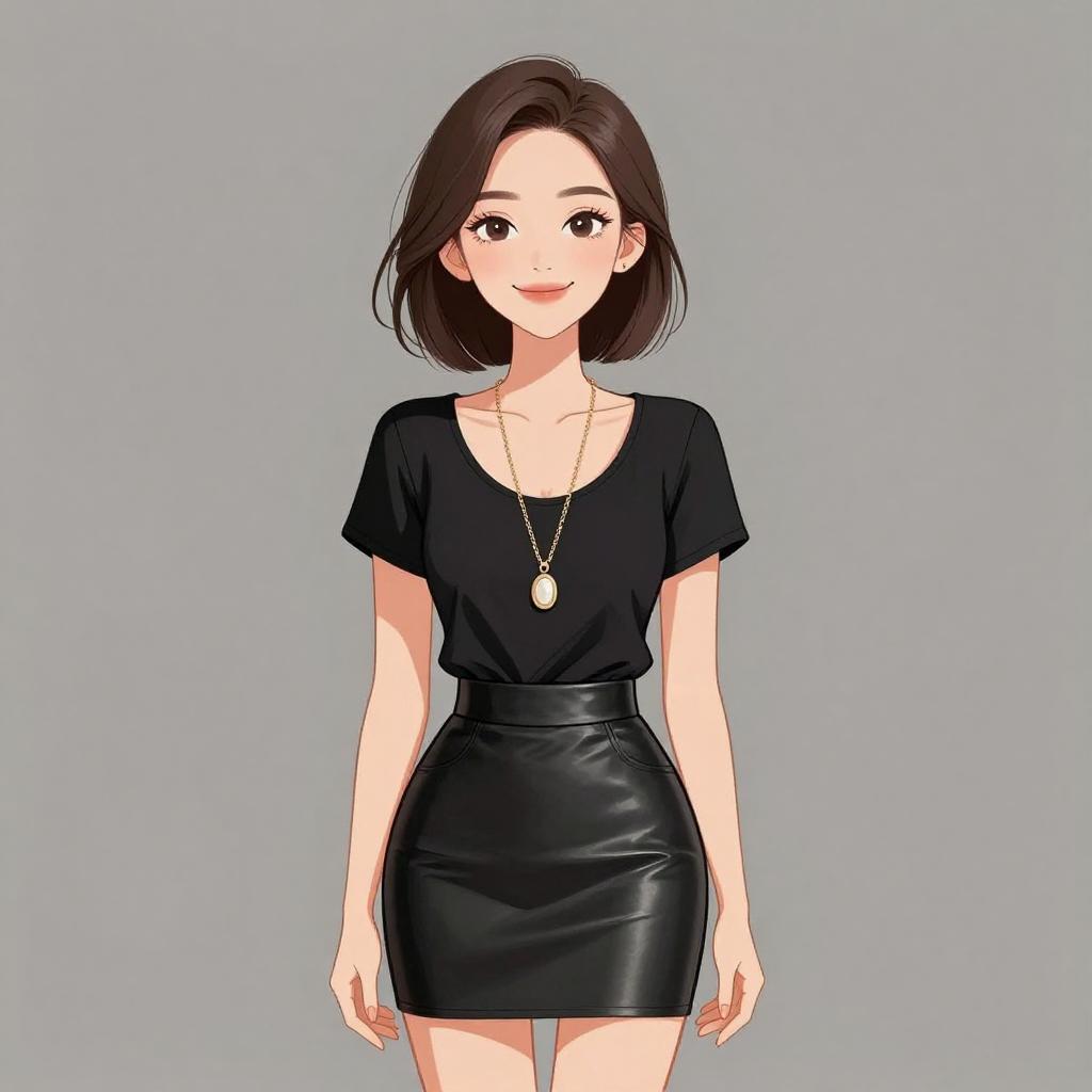 Smiling Woman in Green Blouse and Leather Skirt