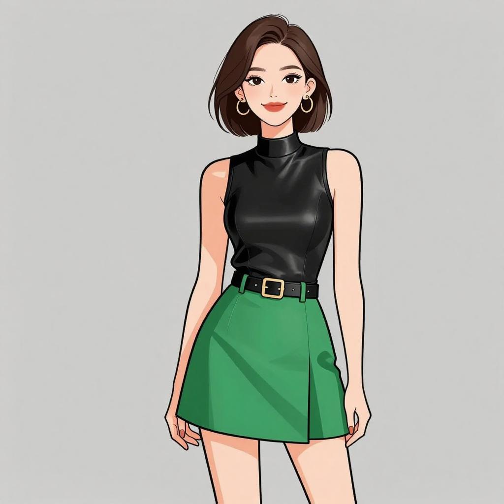 Woman with pretty face and pretty hair. smiling Woman, edgy, dark green boat neck blouse with open shoulder detail and metallic bead embellishments, short sleeves, tucked into a black faux leather mini skirt with an asymmetrical wrap design and a central zipper. --sref 1467