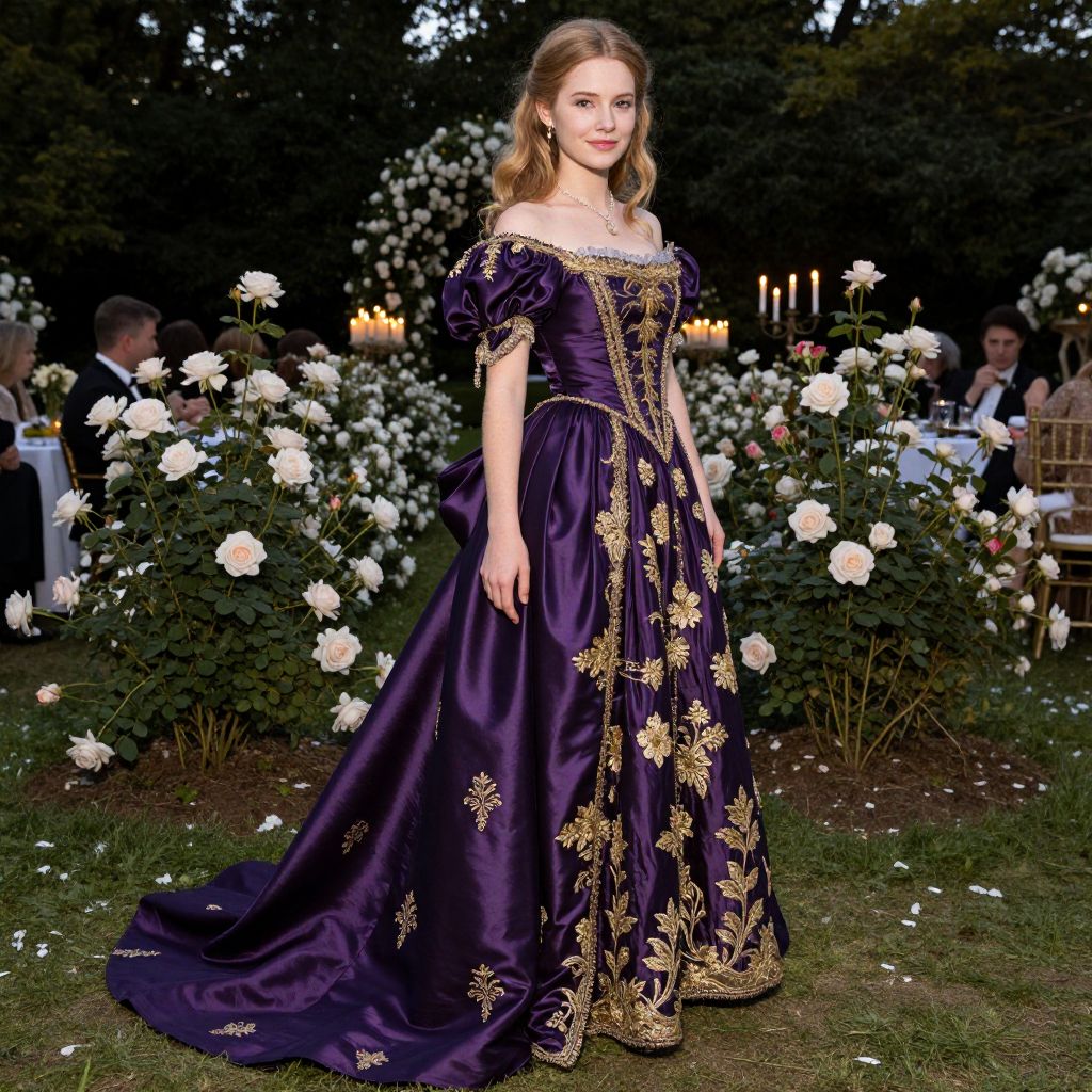Photograph of a young woman with fair skin and wavy blonde hair, wearing an elegant, deep purple satin gown adorned with gold floral embroidery. The gown has off-the-shoulder puffed sleeves and a fitted bodice, flowing into a full skirt with a train. She stands in a garden at night, surrounded by blooming white roses and lit by candles. In the background, seated guests in formal attire are visible, adding to the event's sophisticated atmosphere. The image captures her poised and elegant stance amidst the romantic garden setting.