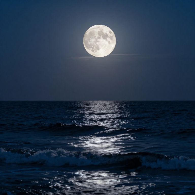 A serene digital artwork captures the ethereal glow of a full moon dancing across the ocean's surface, casting a silvery sheen on the waves and creating a tranquil, high-definition nocturnal seascape under dramatic lighting.
