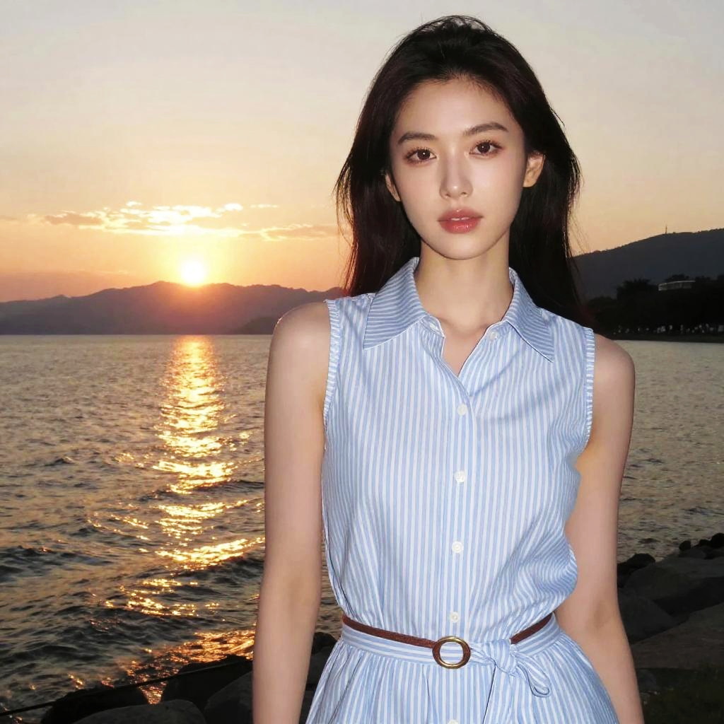 A Pear-shaped body type woman in a modern casual sleeveless shift dress with a navy blue floral and geometric print, paired with a black leather crossbody bag, stands at a serene riverbank at sunset, capturing the tranquil beauty of the moment. Visual style: conclusion. Sexy. Pretty face and beutiful eyes