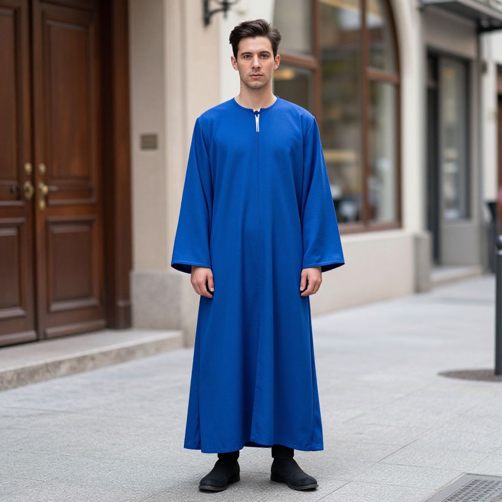 "Zarape Costume, man in a blue robe standing on a sidewalk"