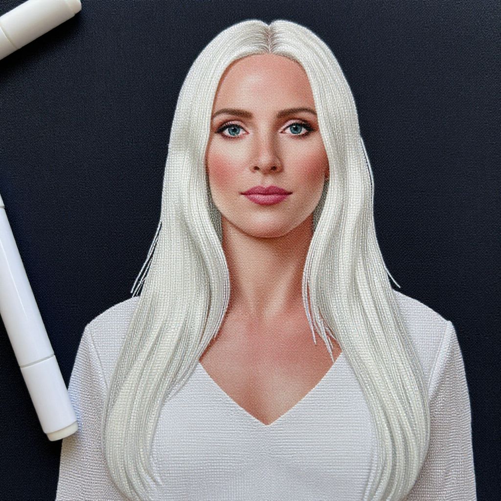 "Embroidery Fabric Marker very pale alabaster skin, beautiful women, white blond straight long hair, white aristocratic dress, 50 year old, serious face expressen, little smile, dark,"