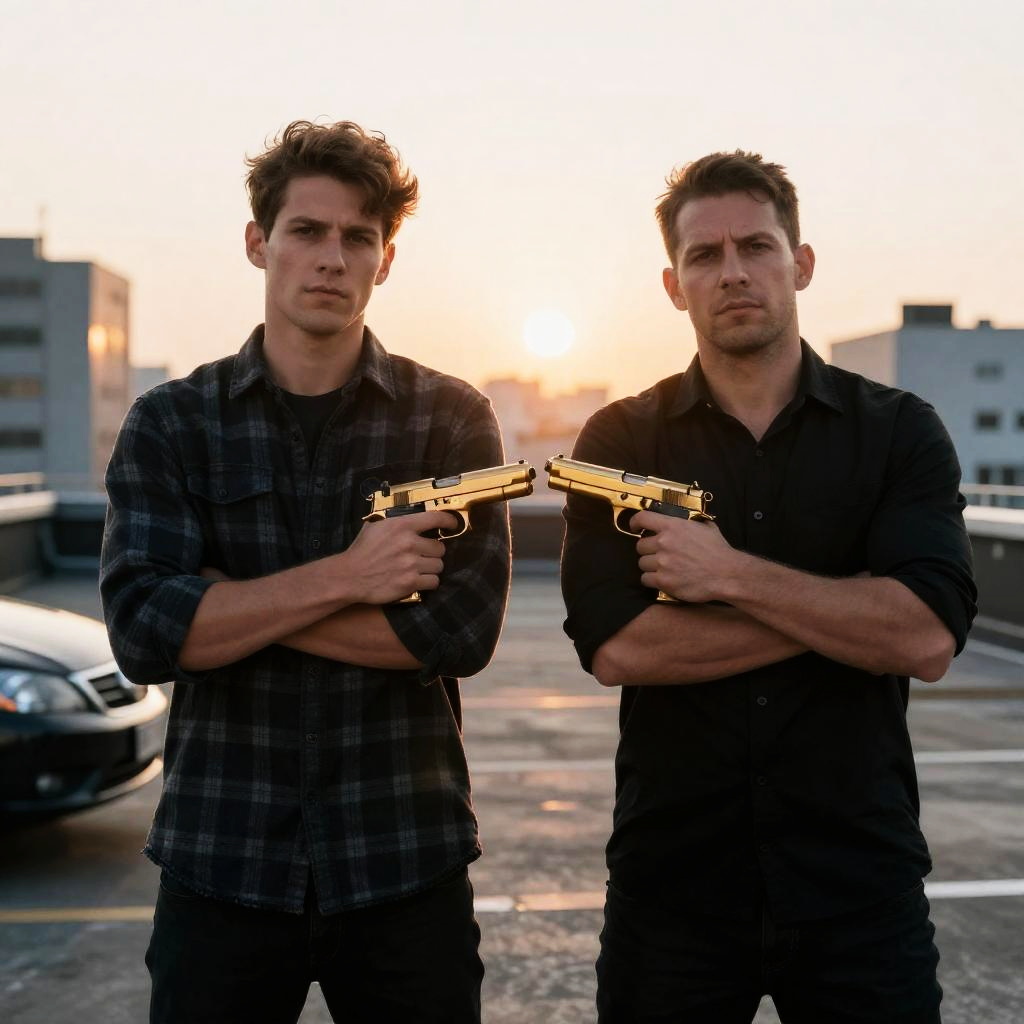 Photograph of two men standing on a rooftop at sunset. Both hold gold-colored handguns, arms crossed. Left man in black plaid shirt, right man in black shirt. Serious expressions. City buildings in background. Car partially visible on left. Sunlight behind.