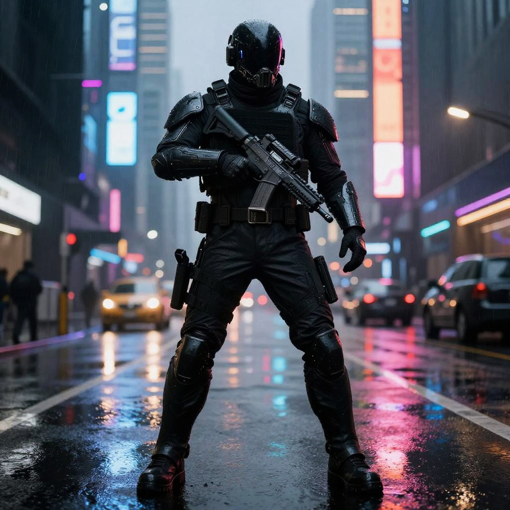 Black tactical outfit on a cyberpunk mercenary, neon cityscape backdrop, rain-soaked streets reflecting vivid lights, futuristic armor design with flexible plating, action-ready stance