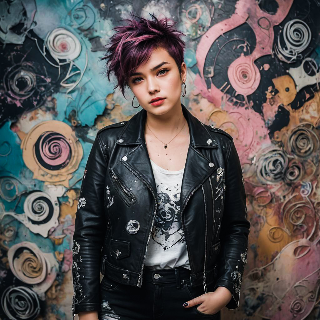 Your answer: Photo-shoot, frowning punk girl, messy short hair, curvy build, leather jacket and jeans, whimsical fantasy vibe, Soft Flocked Muslin Swirl studio background