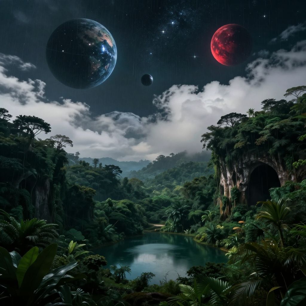 Art by mooncryptowow, psychedelic, <8k, high detail, uhd, sharp focus, palette, photorealistic, absurdres, extreme detail, as much detail as possible, extremely high visibility>, dark green, shiny black, muted azure, muted white, muted red, (a mesmerizing scenery of clouds and stars showing a natural landscape:1.3), celestial objects in a beautiful sky, jungle, pond, deep forest, caves, beautiful earth, afternoon, (rain:0.5), the most beautiful image in the world
