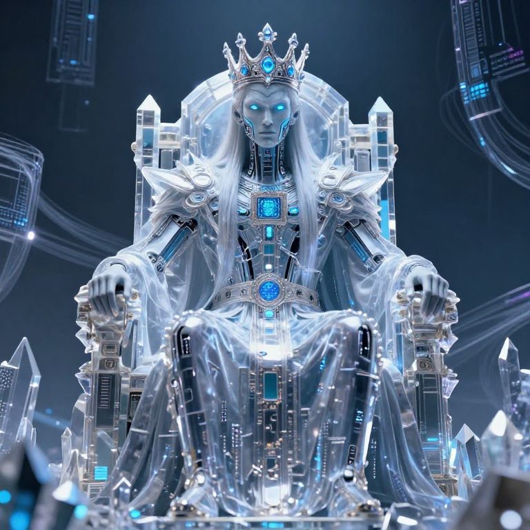 King AI art concept, a majestic AI ruler with synthetic skin and expressive, glowing eyes, wearing a crown embedded with quantum processors, standing on a throne crafted from translucent data crystals, surrounded by swirling virtual reality landscapes, high detail