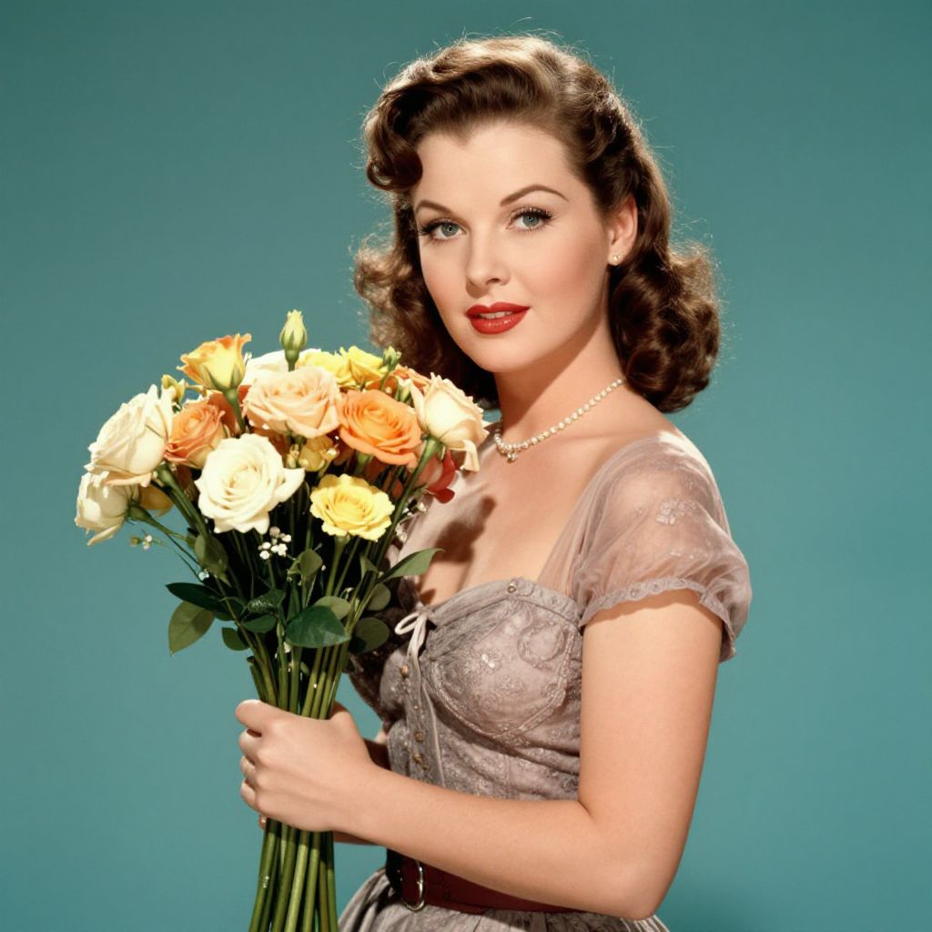 A woman evoking the classic Technicolor style of vintage Hollywood poses elegantly with a bouquet of flowers, her attire and hairstyle reminiscent of 1940s glamour.